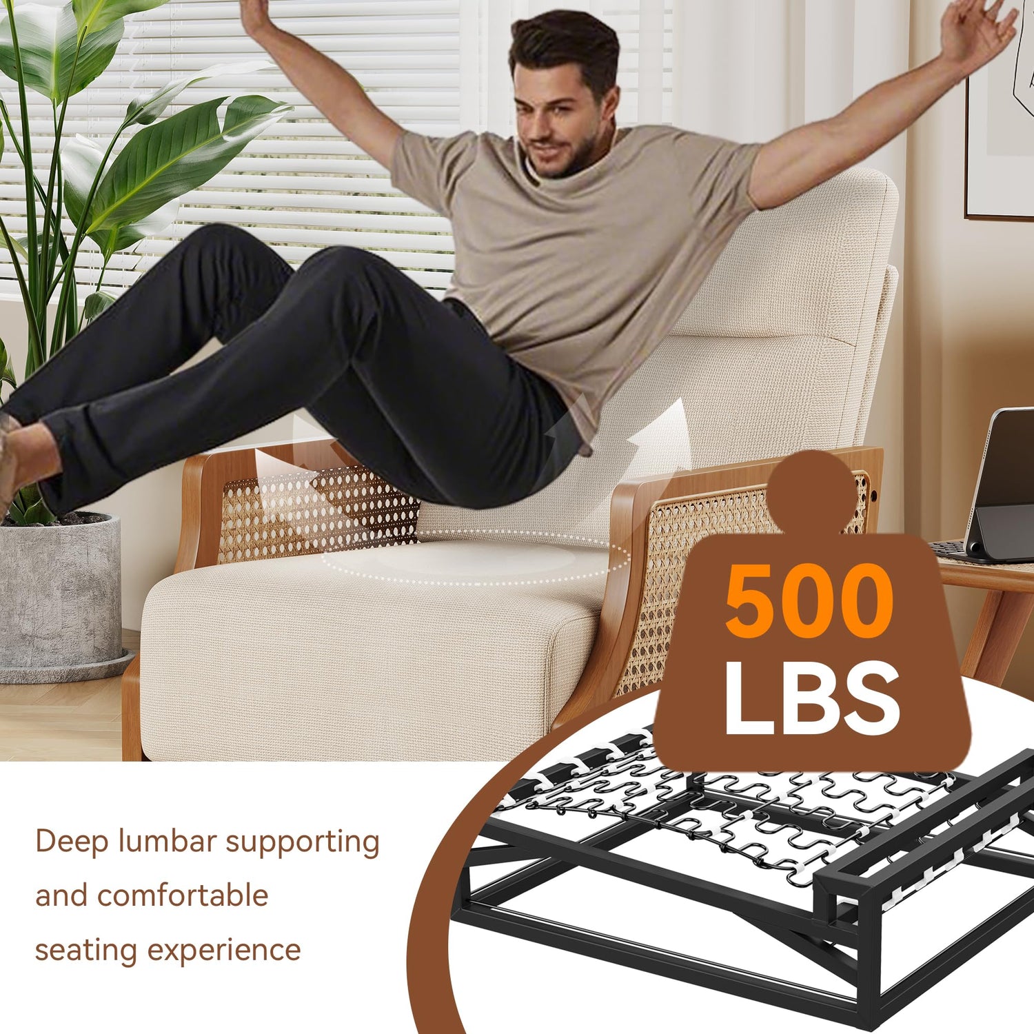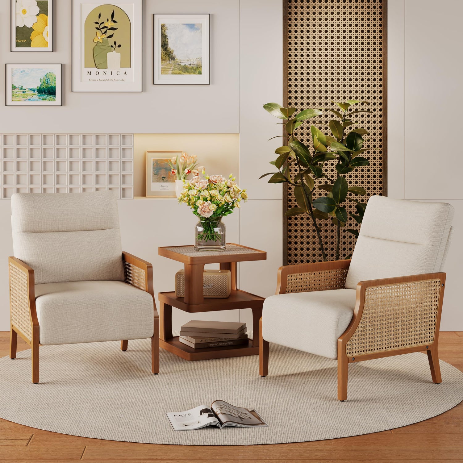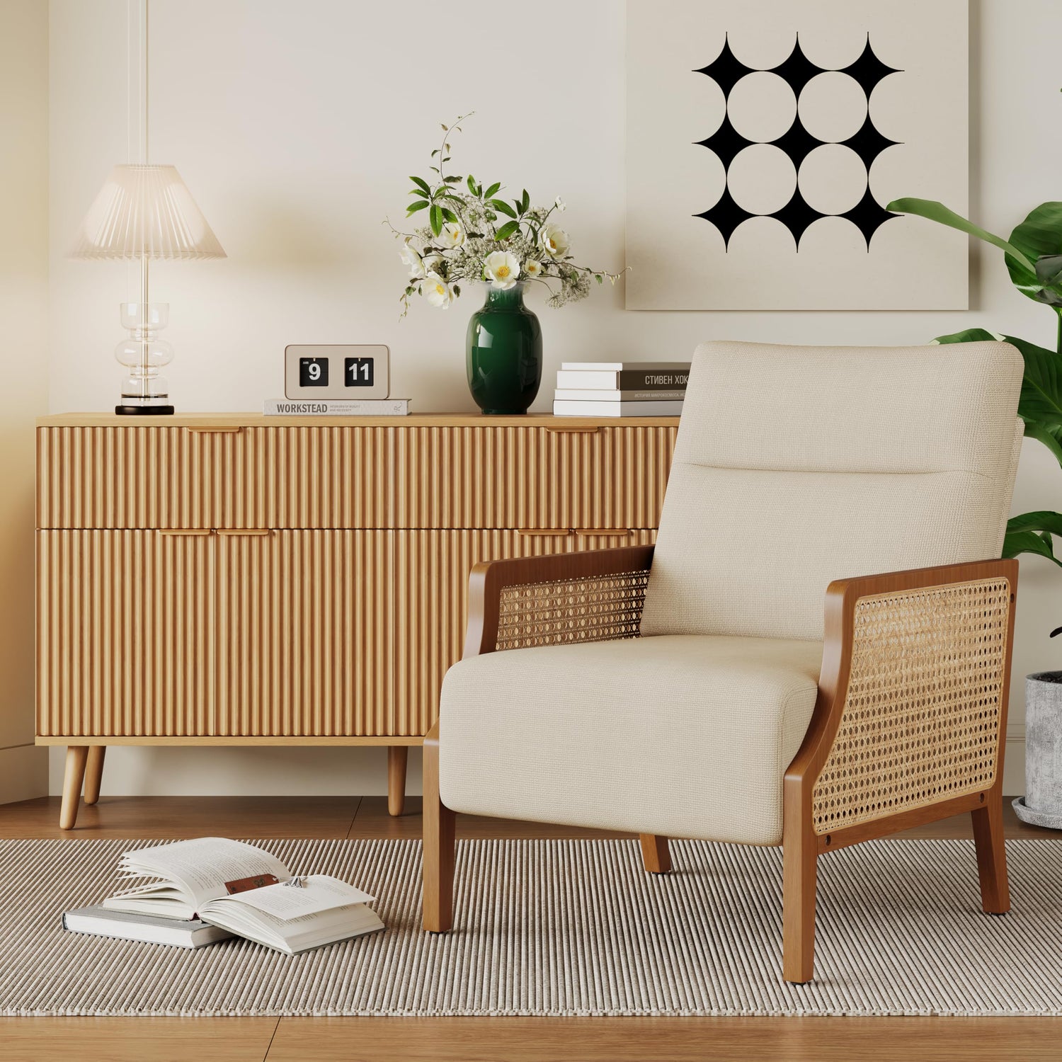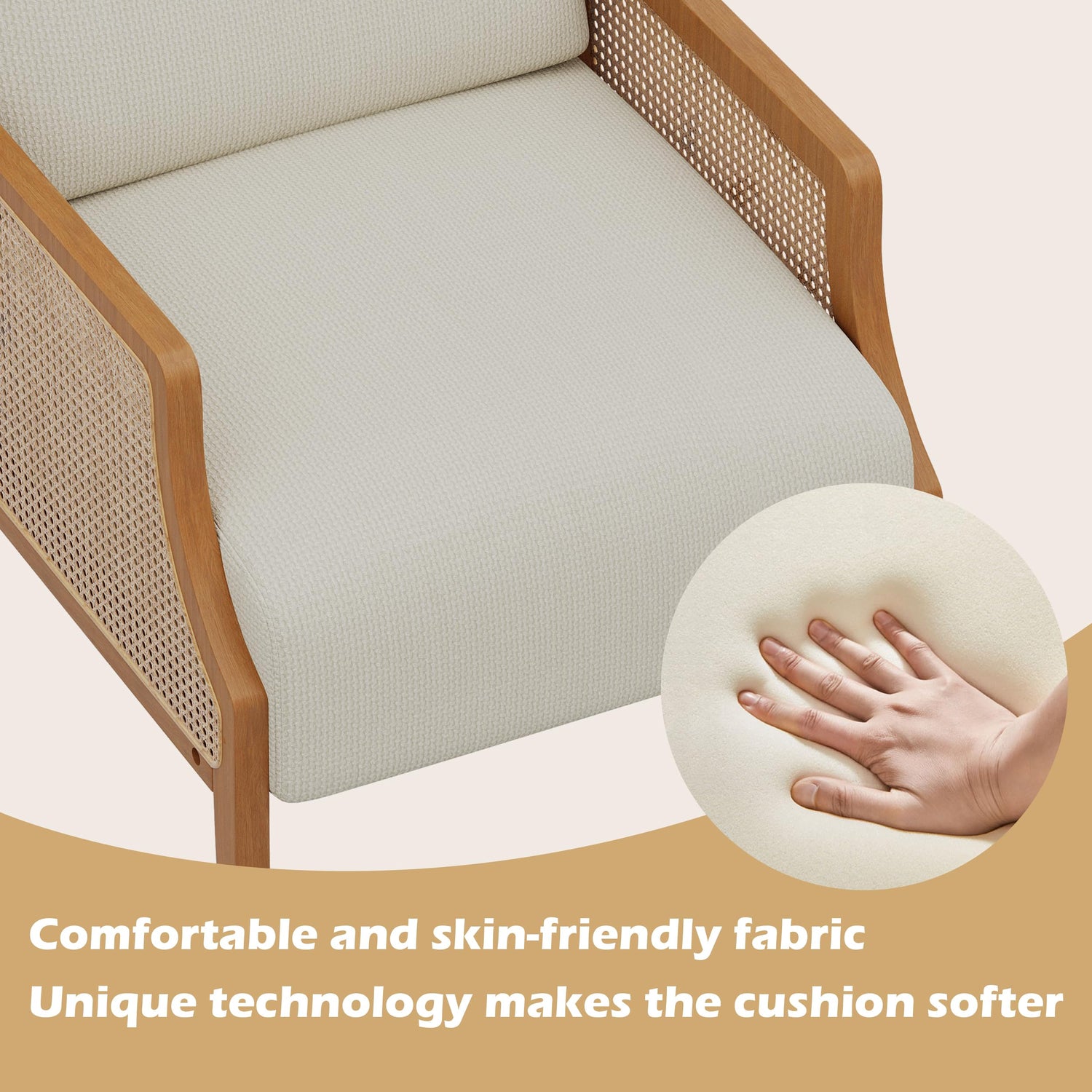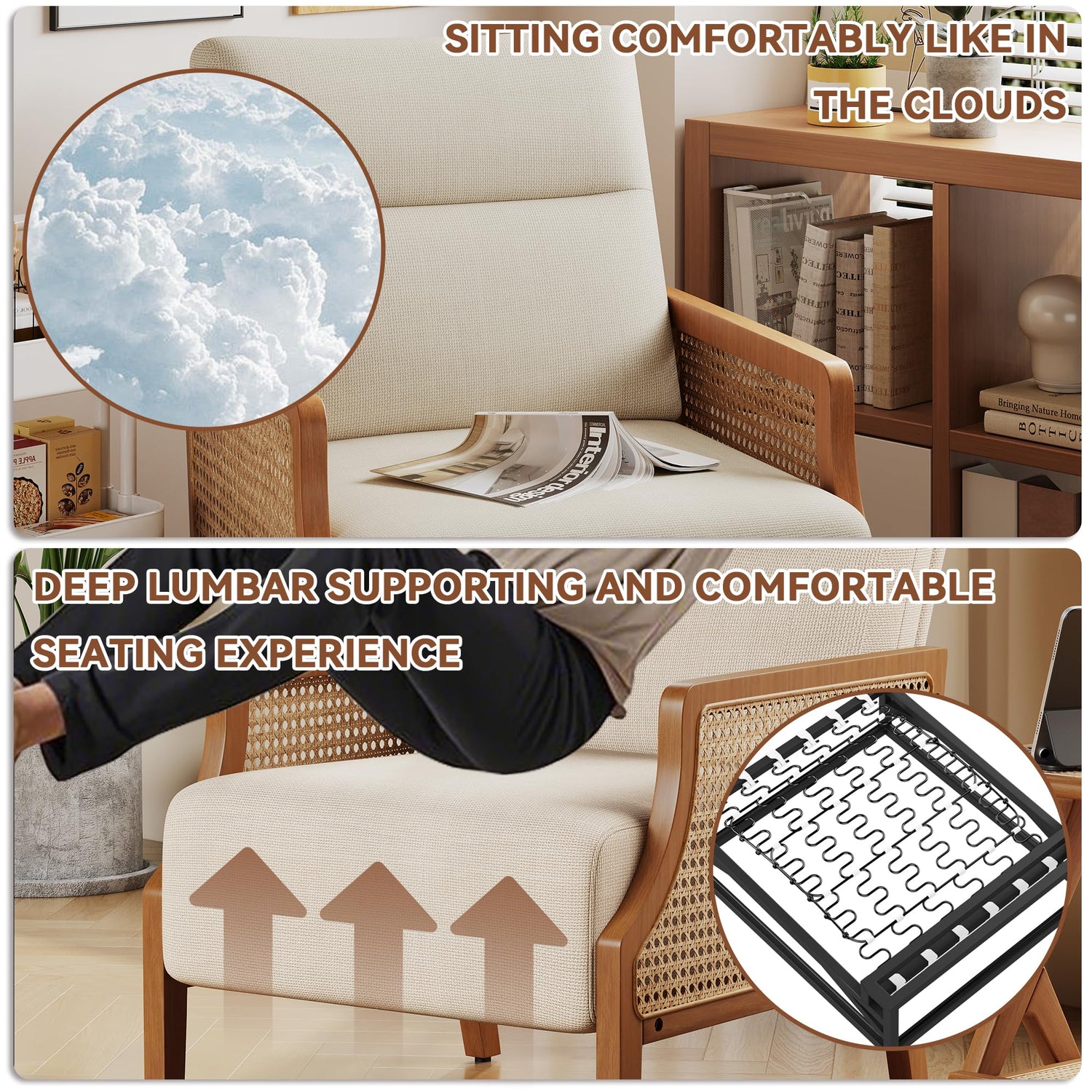 Aklaus Mid Century Accent Chair with Rattan Armrest, Upholstered Living Room Chairs Lounge Fabric Reading Chairs Side Sitting Farmhouse Chair for Living Room, Bedroom, Balcony, Beige