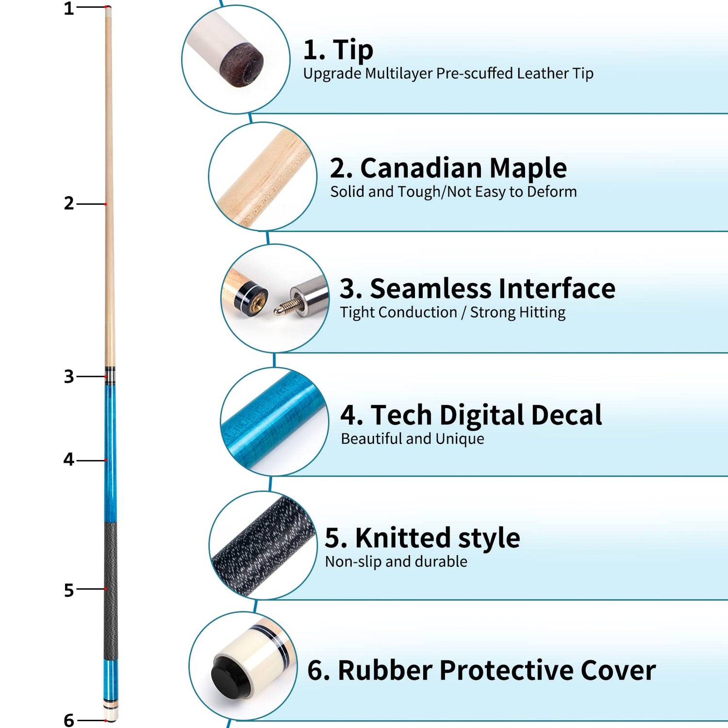 - Canadian Maple Wood:Firm and durable, we have chosen the best quality for the pool stick and the pool cue tips durability. Each pool cue case contains 4 unique pool cues sticks