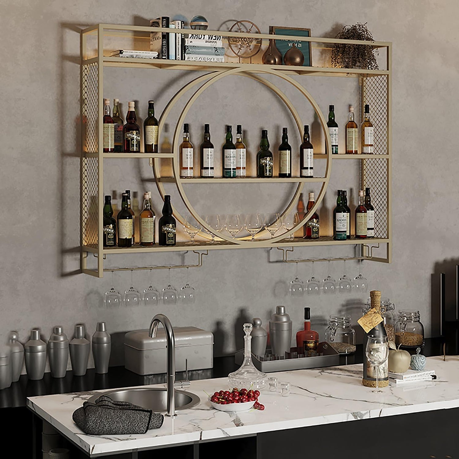 AKOGG Wine Rack Wall Mounted With LED Light & Wine Glass Holder,Iron Bar Liquor Shelf,Floating Wall Wine Shelves,Liquor Bottle Display Shelf,Wine Glass Storage Racks,For Kitchen Wine Cellar,Gold/Black
