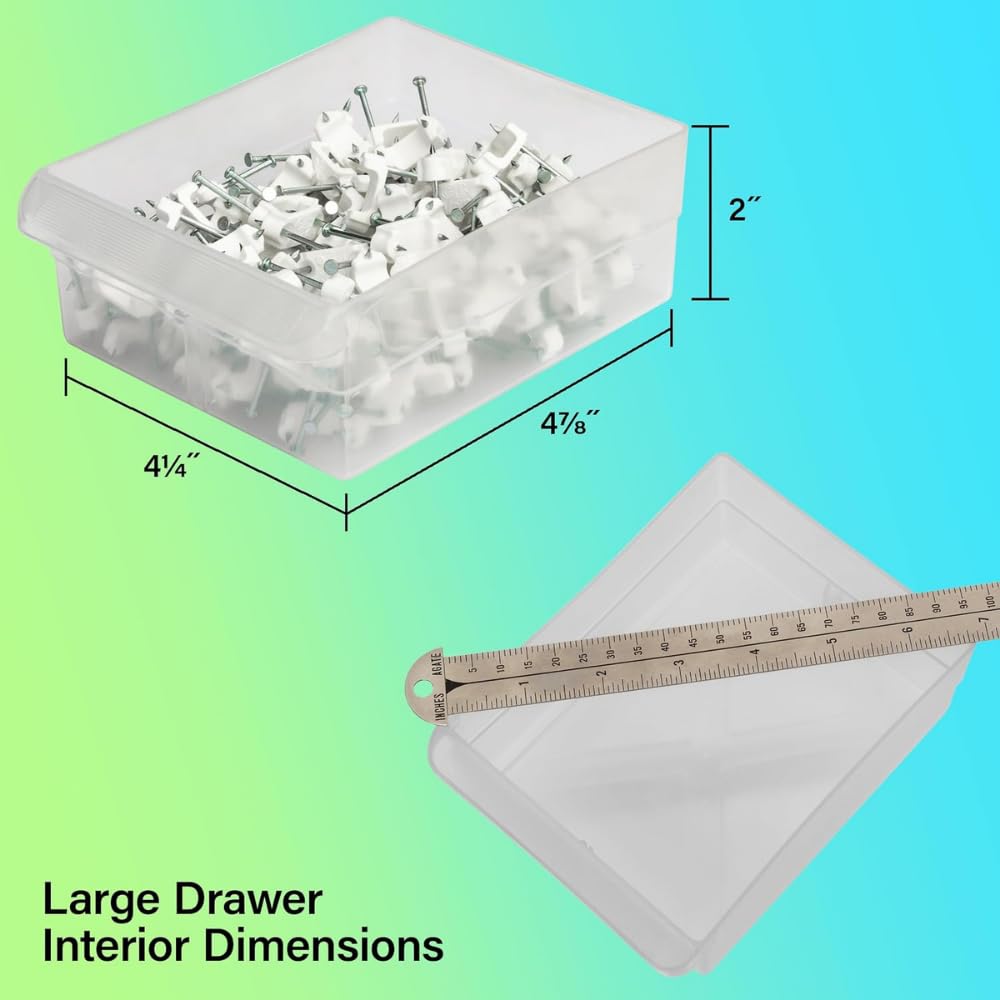 The Akro-Mils 10124 24-Drawer Plastic Storage Cabinet Organizer with Drawers is a great solution for all your storage needs. This heavy-duty cabinet is made in the U.S.A. from rugged, high-impact polystyrene plastic and features 24 large and small plastic drawers offering ample storage space for all your small parts and tools. Plastic organizer drawers inside dimensions: 4-7/8-Inch x 4-1/4-Inch x 2-Inch. Whether you're looking to organize your garage, workshop, classroom, or home, this storage cabinet has you covered. Garage owners and businesses will love the versatility of this cabinet, with the plastic storage drawers perfect for use as a hardware organizer, screw organizer box, or for battery storage. Keep your nails and other small parts accessible with ease. Teachers can use the cabinet for classroom storage, as a teacher toolbox, art storage, craft storage box, for scrapbook supplies, and more. This plastic storage cabinet is also perfect for home storage and organization. Use it as a lego organizer, craft organizer, hobby organizer, or bead storage organizer. It's even great for makeup storage and organization or for medicine and first aid supplies. And with the ability to stack cabinets securely or wall-mount them using keyhole slots, along with finger-grip drawer pulls and rear stop tabs to prevent contents from spilling, this cabinet has everything you need to keep your items safe and organized. Cabinets have 8 small crosswise dividers and 4 large length dividers included. Included dividers are molded into the back of the cabinet (remove with scissors). Additional dividers can be purchased separately.