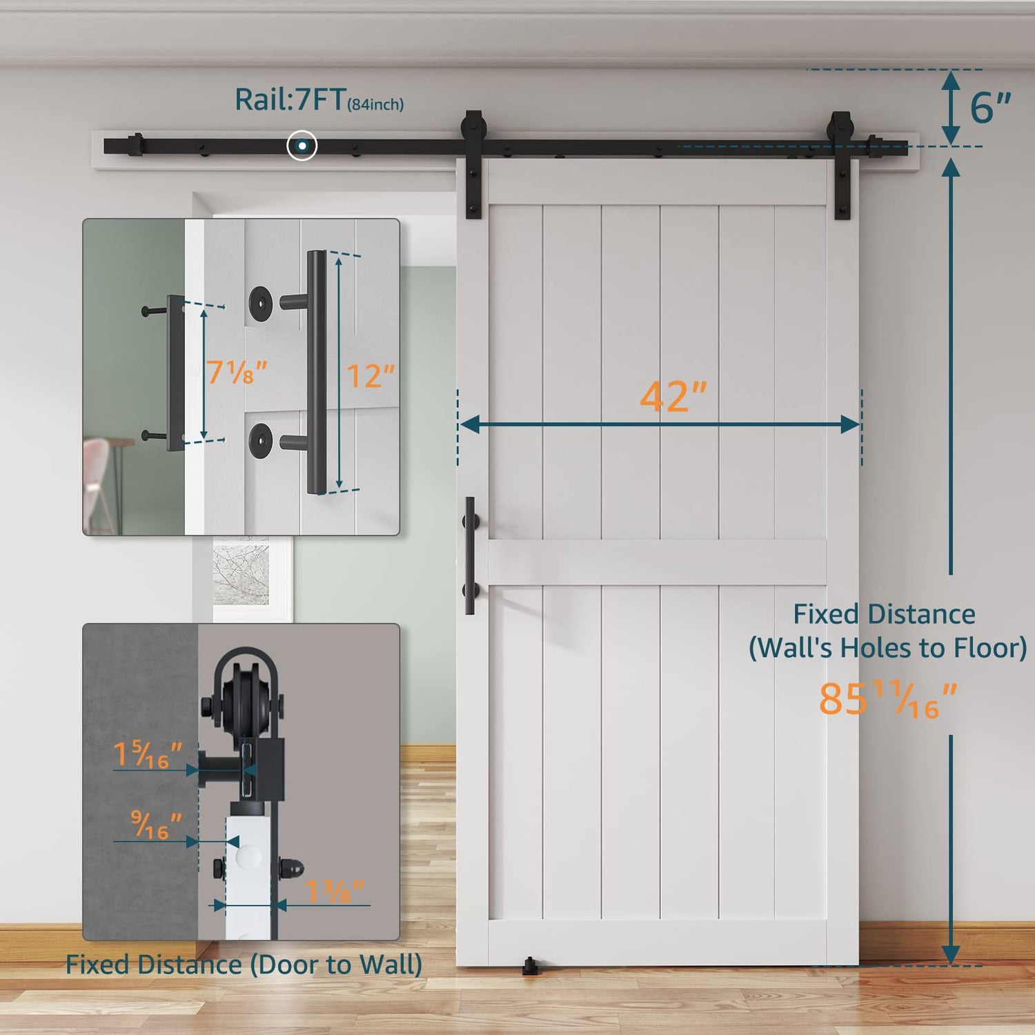 - Package Includes: 1x Barn Door, Width: 42'' Height: 84'' Thickness: 1 3/8'', H-shape; 1 X 7 FT Barn door hardware kit, 1x Barn Door Handle, length: 12''; 1x Barn Door Floor Guide, as the picture shows.
