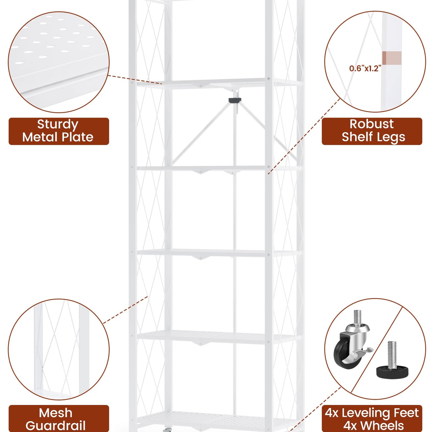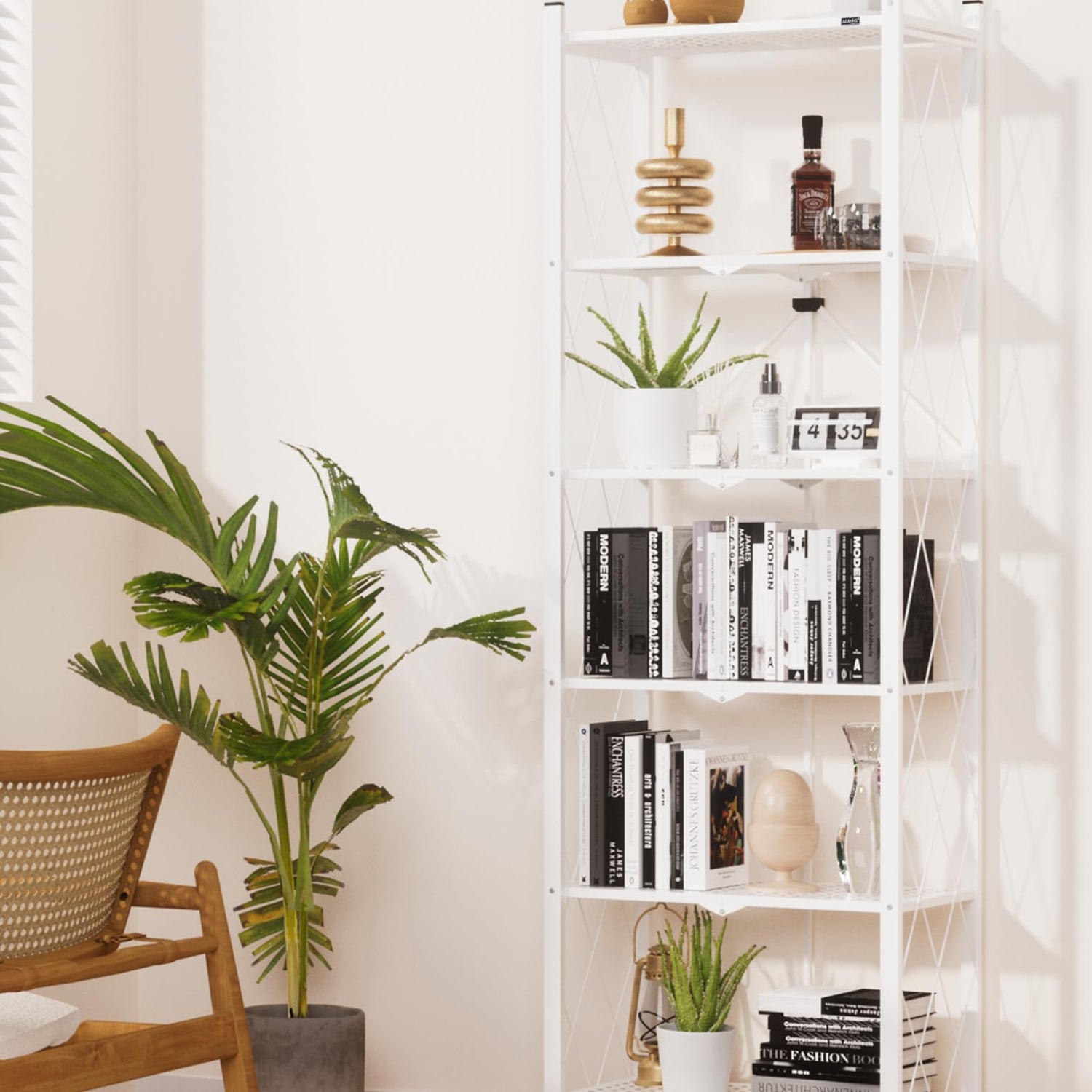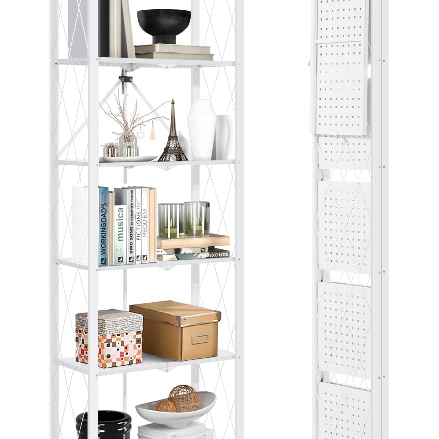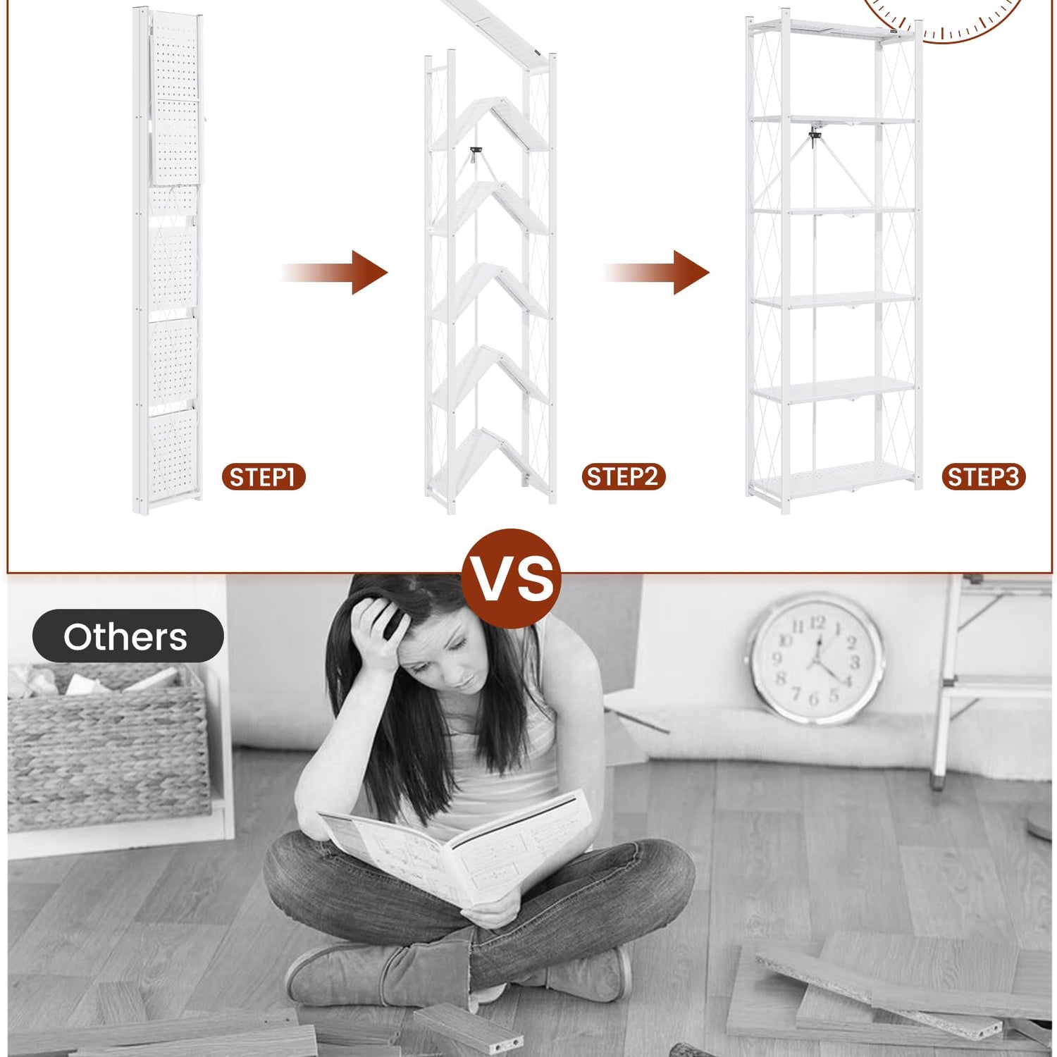 ALANNG 73.6 Inch Folding Bookshelf, 6 Tier Metal Bookcase and Bookshelves, Tall Shelves for Living Room Office Bedroom, Heavy Duty Book Shelve Free Standing Open (White, 1PACK)