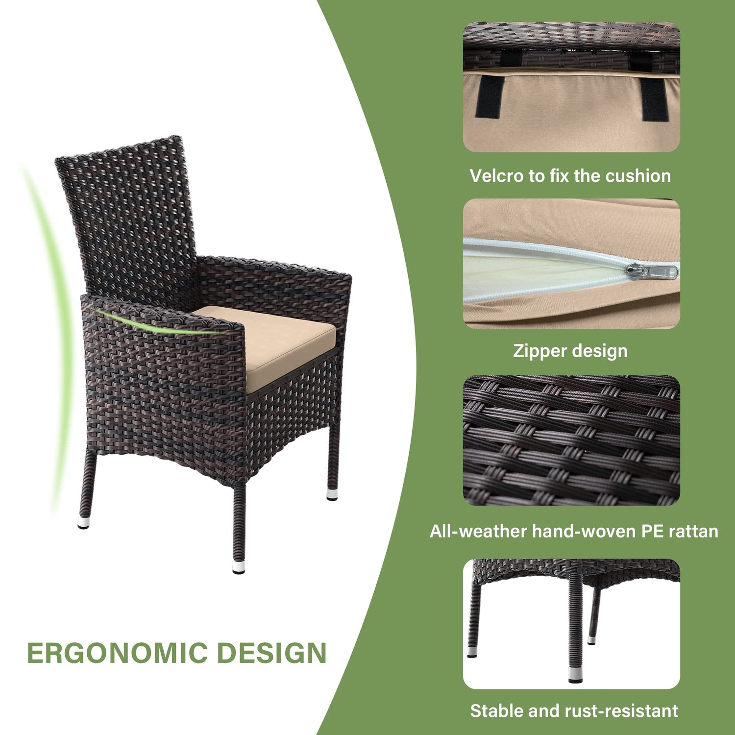 - Premium Materials: ALAULM outdoor wicker dining set is made up of two parts, one part is galvanized iron pipe, which is very strong and light; the other part is hand-woven PE rattan , which is available in all weather. The cushions are filled by high-quality filling and their covers are of high color fastness. They will not fade easily.