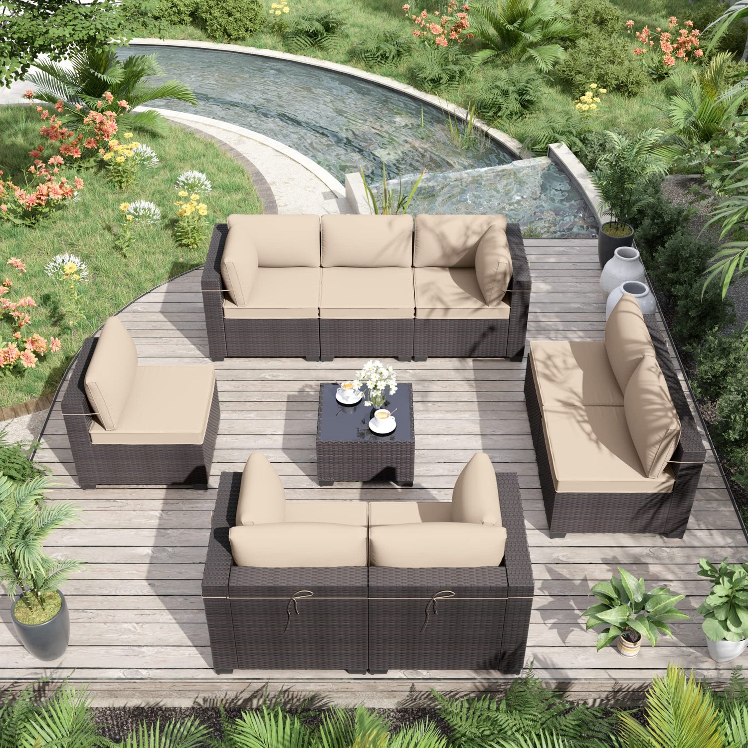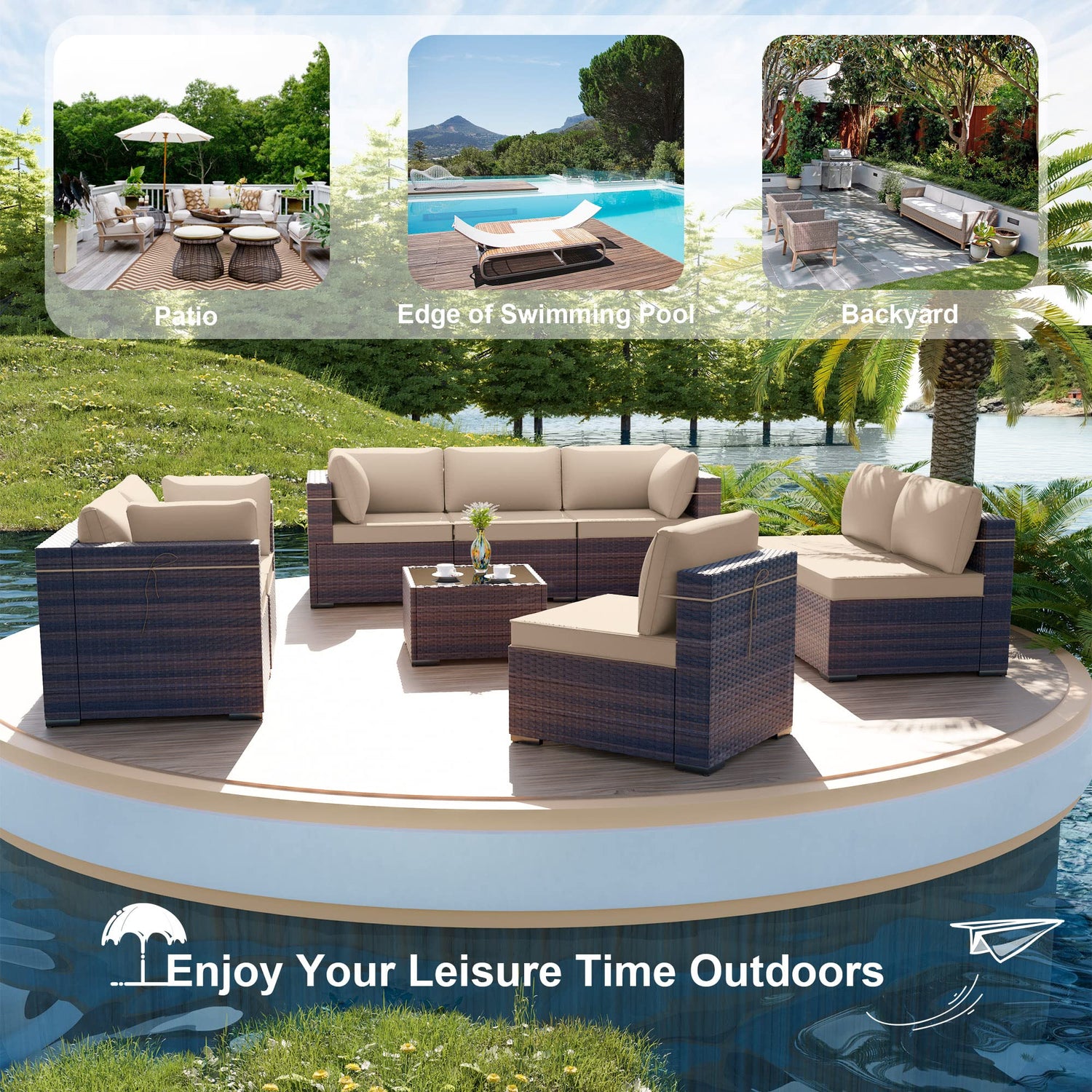 ALAULM 9 Pieces Patio Furniture Set Outdoor Sectional Sofa Sets Brown PE Rattan Patio Conversation Sets w/8 Sand Seat Cushions and 1 Coffee Table