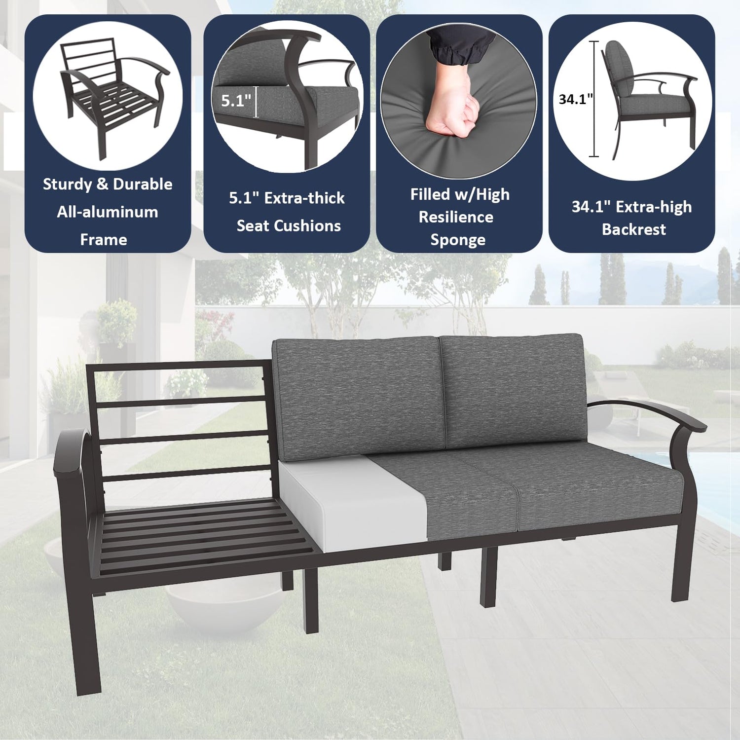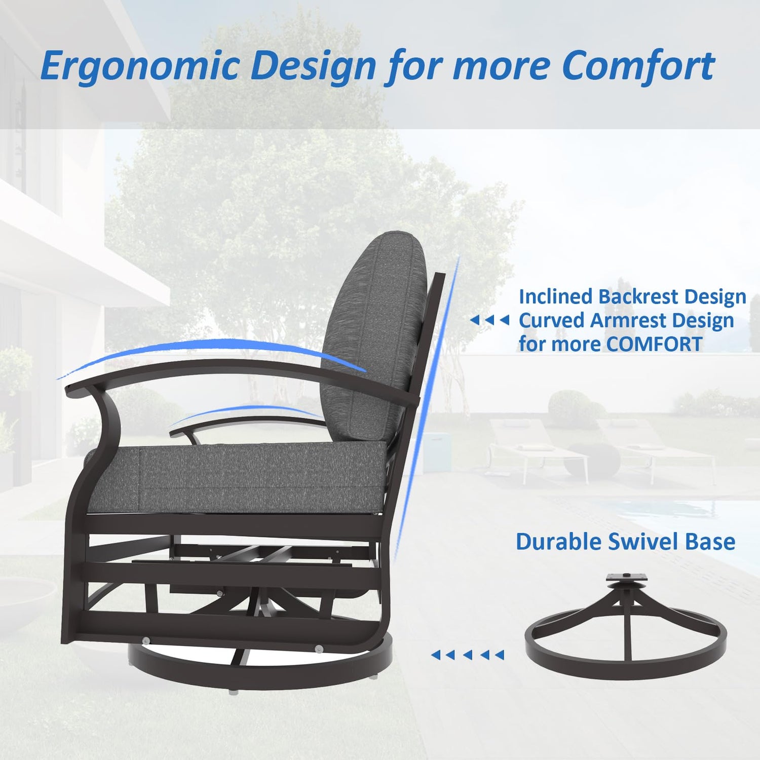 - 360 DEGREE SWIVEL & ROCKING SOFAS: Our all-aluminum outdoor furniture set includes 2 swivel rocking sofas. You can rock back and forth or swivel 360° while listening to your favorite music or watching the beautiful sunset and enjoy your own leisure time.