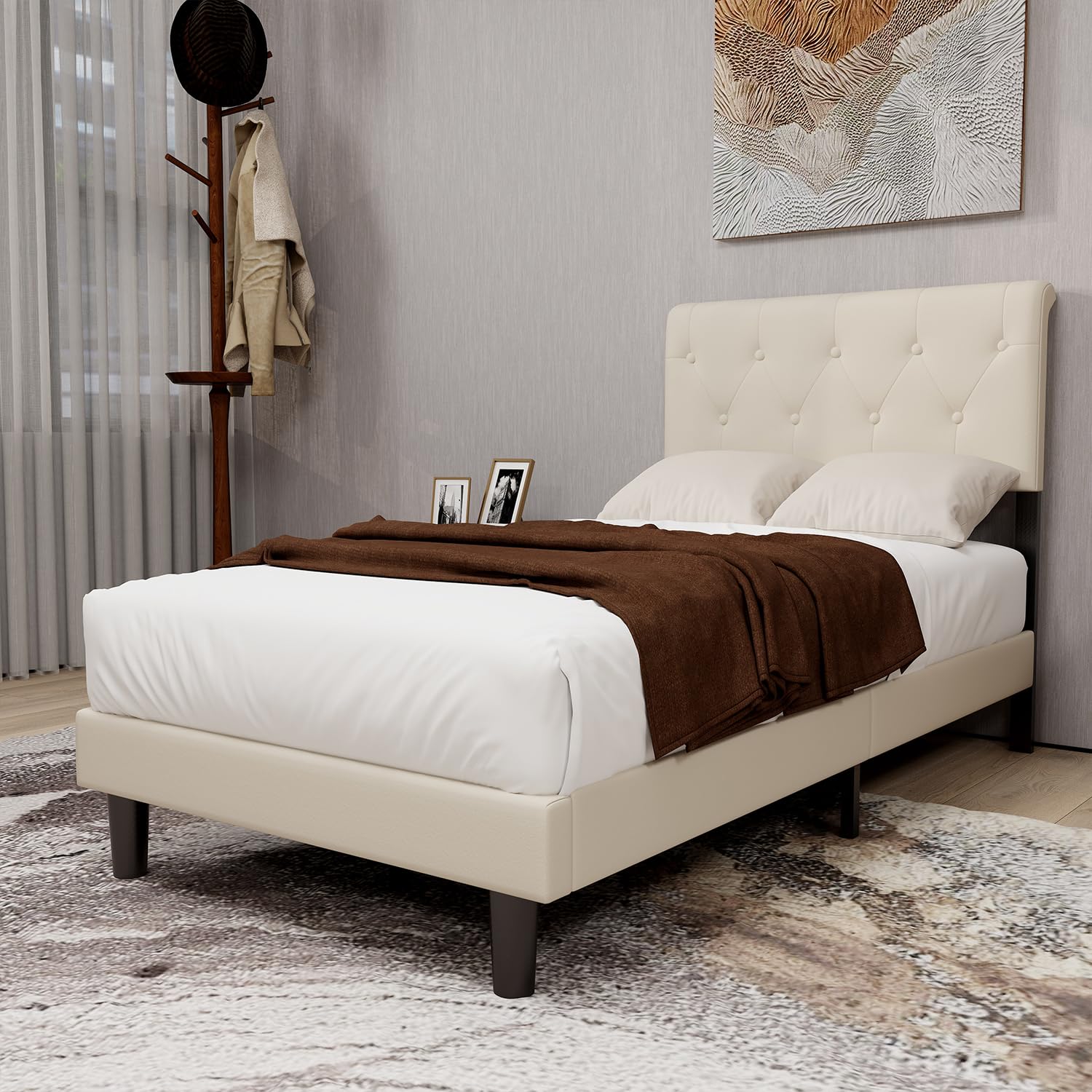 alazyhome Upholstered Platform Twin Size Bed Frame with Adjustable Button Tufting Headboard Wooden Slats Support No Noise Easy Assembly Beige Velvet