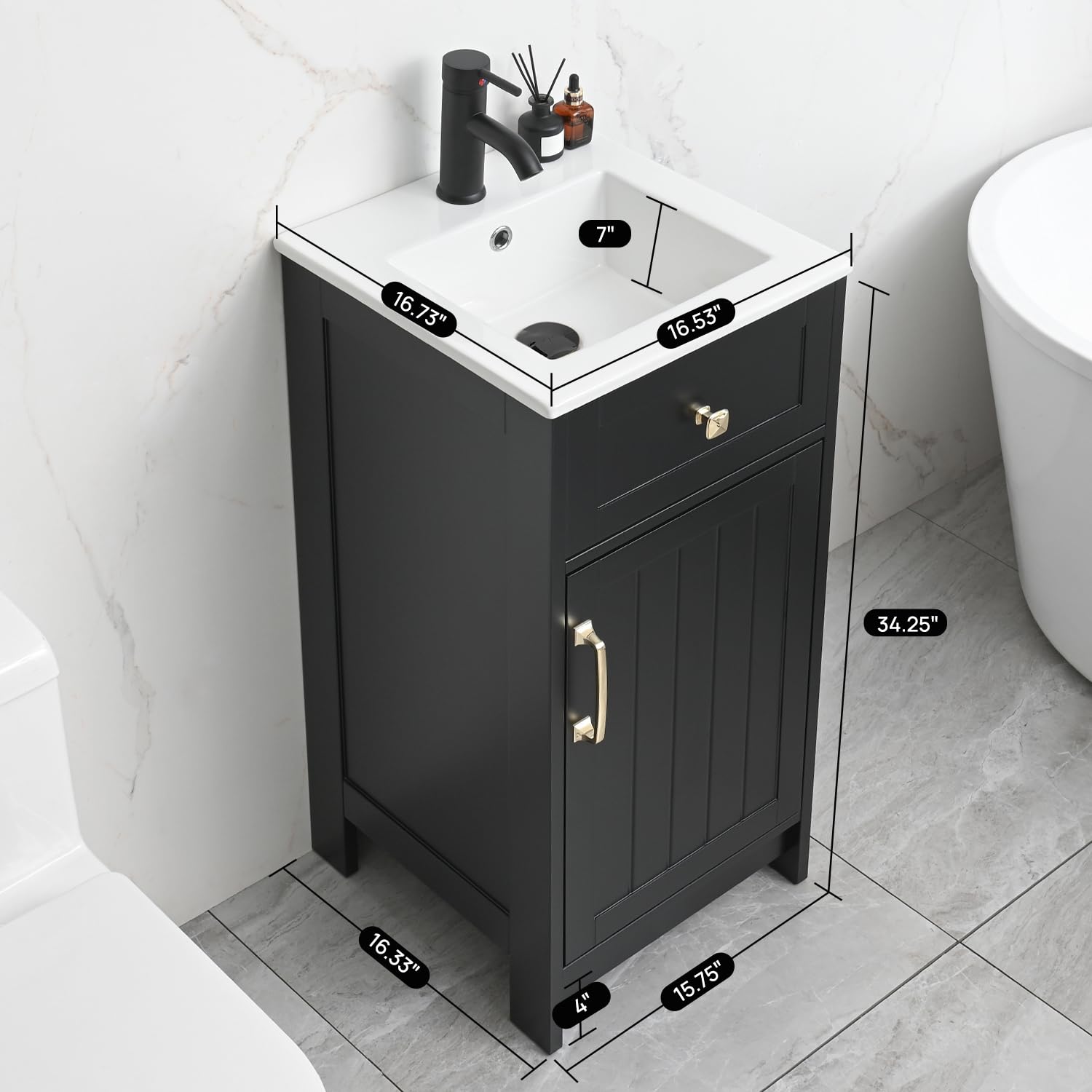 - Perfect for Small Spaces: This 16-inch bathroom vanity is designed to fit comfortably in small bathrooms, apartments, or dorm rooms. With its compact size of 16.73” D x 16.53” W x 34.25” H, it maximizes utility without taking up much space.