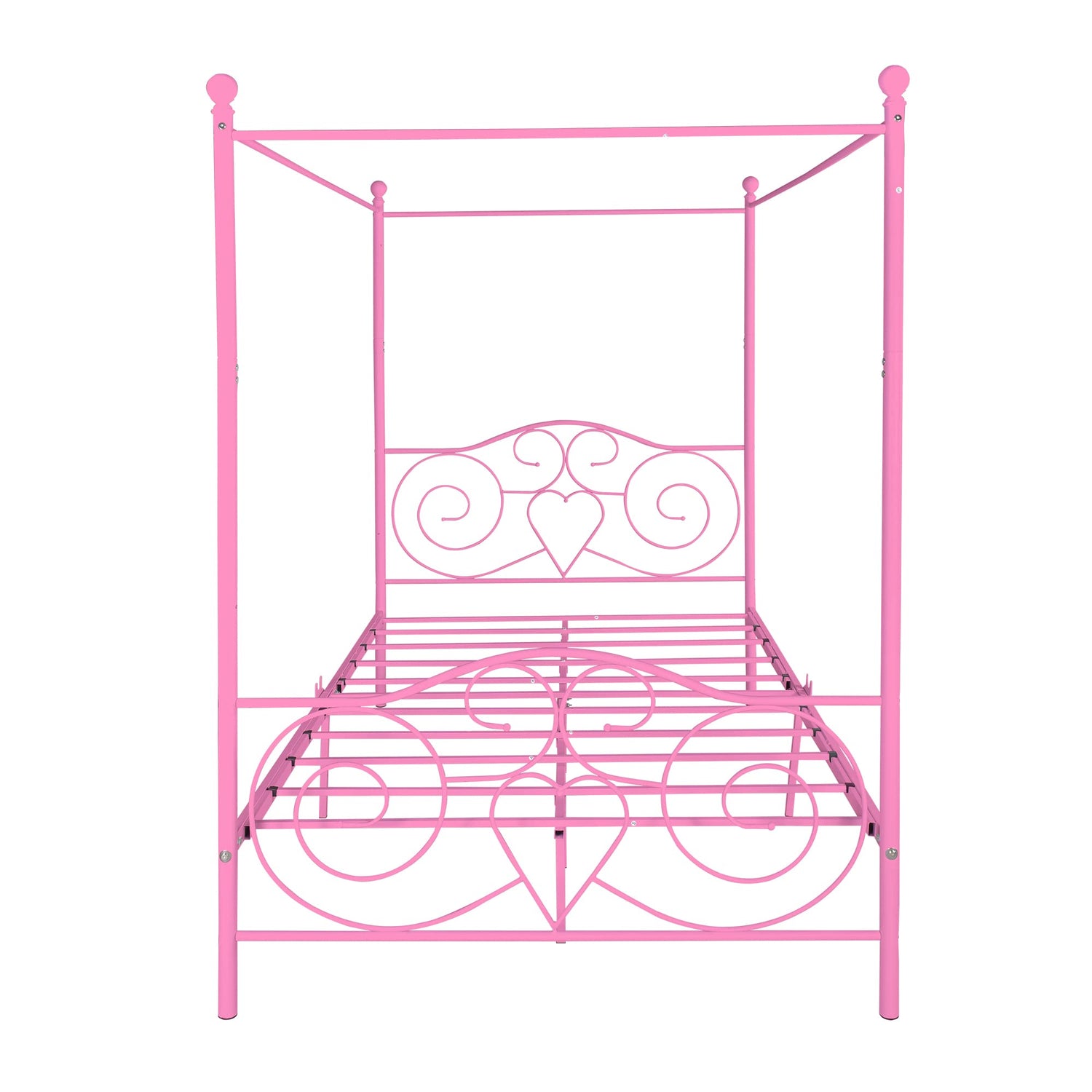 Details: Color:Pink | Size:Full Full size 4 post canopy platform bed frame Frame material: Metal Full Steel slats with metal center support Great under bed clearance for storage Box spring not required Assembly Required Mattress not included Product information: Product Dimensions:78.74L x 54W x 76.38H. Suitable mattress size: 75(L) x 54(W). Product Weight:58 lbs. Package Includes: Canopy bed frame Assembly Instruction Screws + Allen Key Please follow the instruction manual to install the bed. If you have any question, please contact our team immediately.