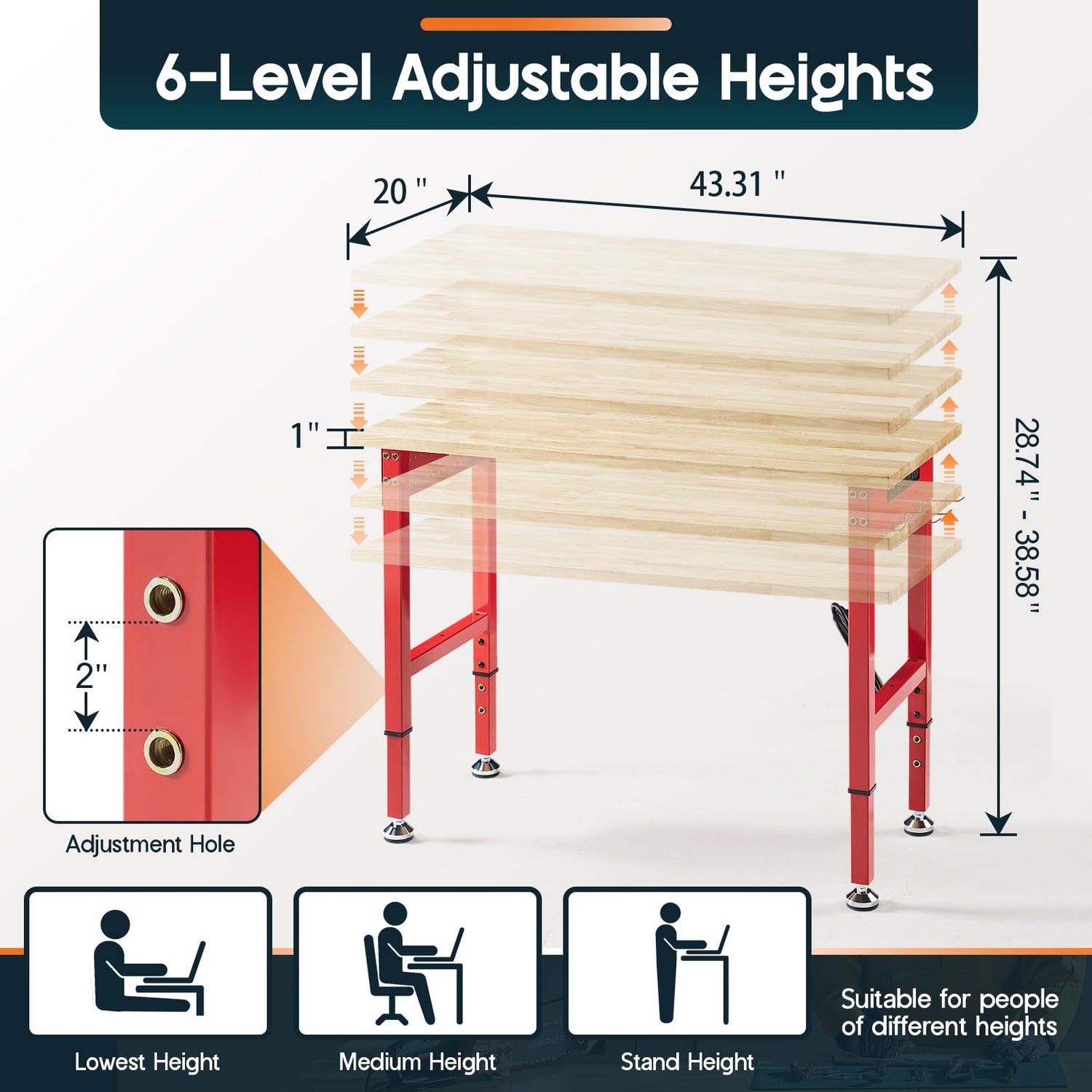 Albott Adjustable Workbench, 28.7-38.6" Height, Rubber Wood Top, Heavy-Duty Design with Power Outlets & Hooks, 2000 LB Capacity for Garage, Workshop, Home, or Office,Red