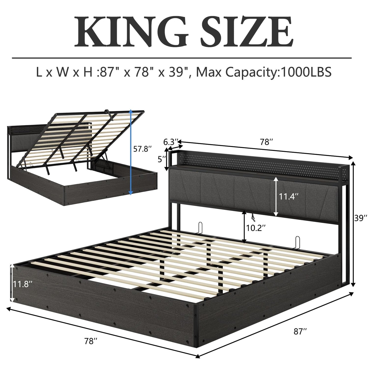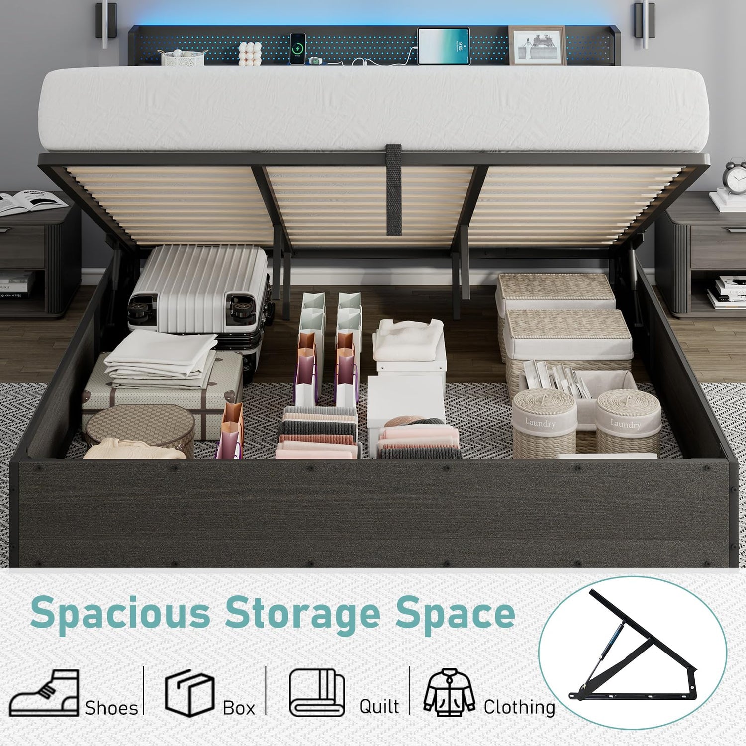 Albott King Size Lift Up Storage Bed Frame, Modern RGB LED Light Platform Bed Frame with Charging Station/Linen Upholstered Headboard/No Box Spring Needed, Black