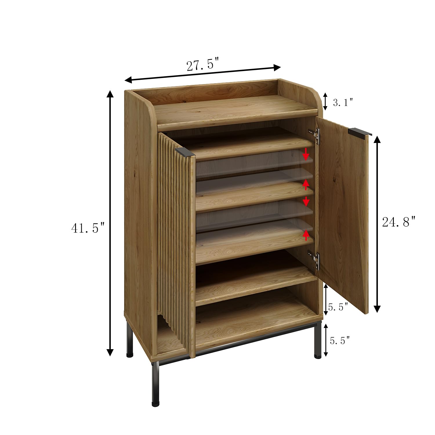 Details: Stylish and simple: The shoe cabinet has long, vertical grooves carefully carved on the surface, adding a touch of charm and texture, and the stylish metal handles and legs add a fashionable style and modern atmosphere, making it a perfect decoration in any corner of your home. Flexible and large capacity: The wide countertop is suitable for storing keys, bags and daily necessities, and there is a 5-layer shoe cabinet with adjustable panels to accommodate shoes of different heights, such as slippers, formal shoes, high heels, casual shoes, boots, etc. It can be placed in your living room, bedroom, kitchen, hallway, entryway, study, etc., with a size of 27.5 inches wide x 13.8 inches deep x 41.7 inches high. Sturdy and durable: Our freestanding shoe rack closet shoe rack is made of high-quality wooden boards to ensure a sturdy and durable structure and long service life, and the sturdy and durable hinges allow you to open and close the door easily. Perfect shoe storage solution: No more worrying about shoes scattered all over the house or clean shoes being invaded by dust before wearing. Say goodbye to messy entryways and crowded closets. Easy to Assemble: All parts of this wooden shoe cabinet are numbered, and an installation manual is included with clear instructions to guide you through the assembly process. If you encounter any problems, please contact us in time and we will serve you wholeheartedly.
