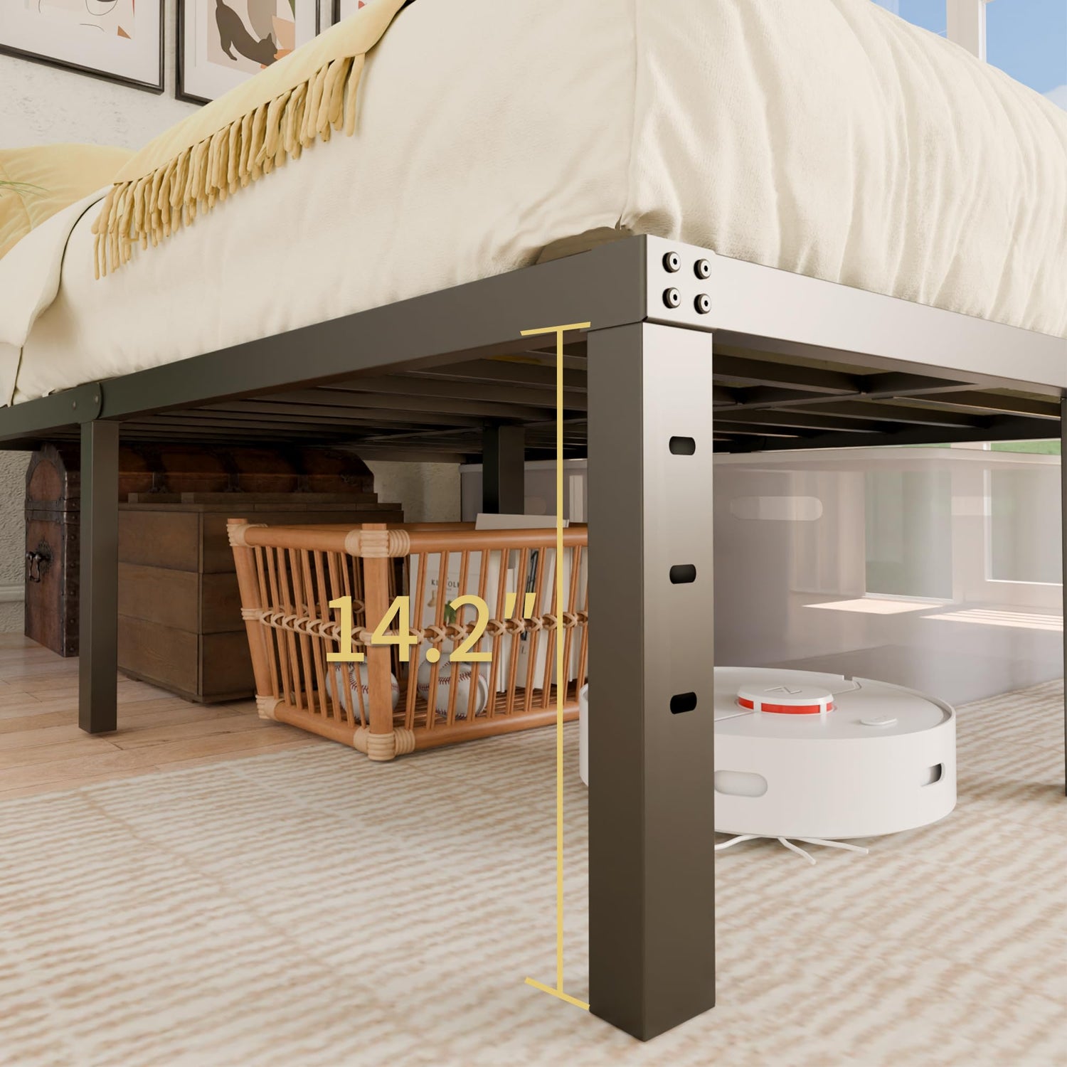 - NOISE ELIMINATION - No Box spring needed for the metal bed frame queen. Rubber cushion of the metal bedframe queen-size is good for noise elimination, Every bed legs designed with non-scratch gaskets to protect your fancy floor and provides you with a peaceful sleep.