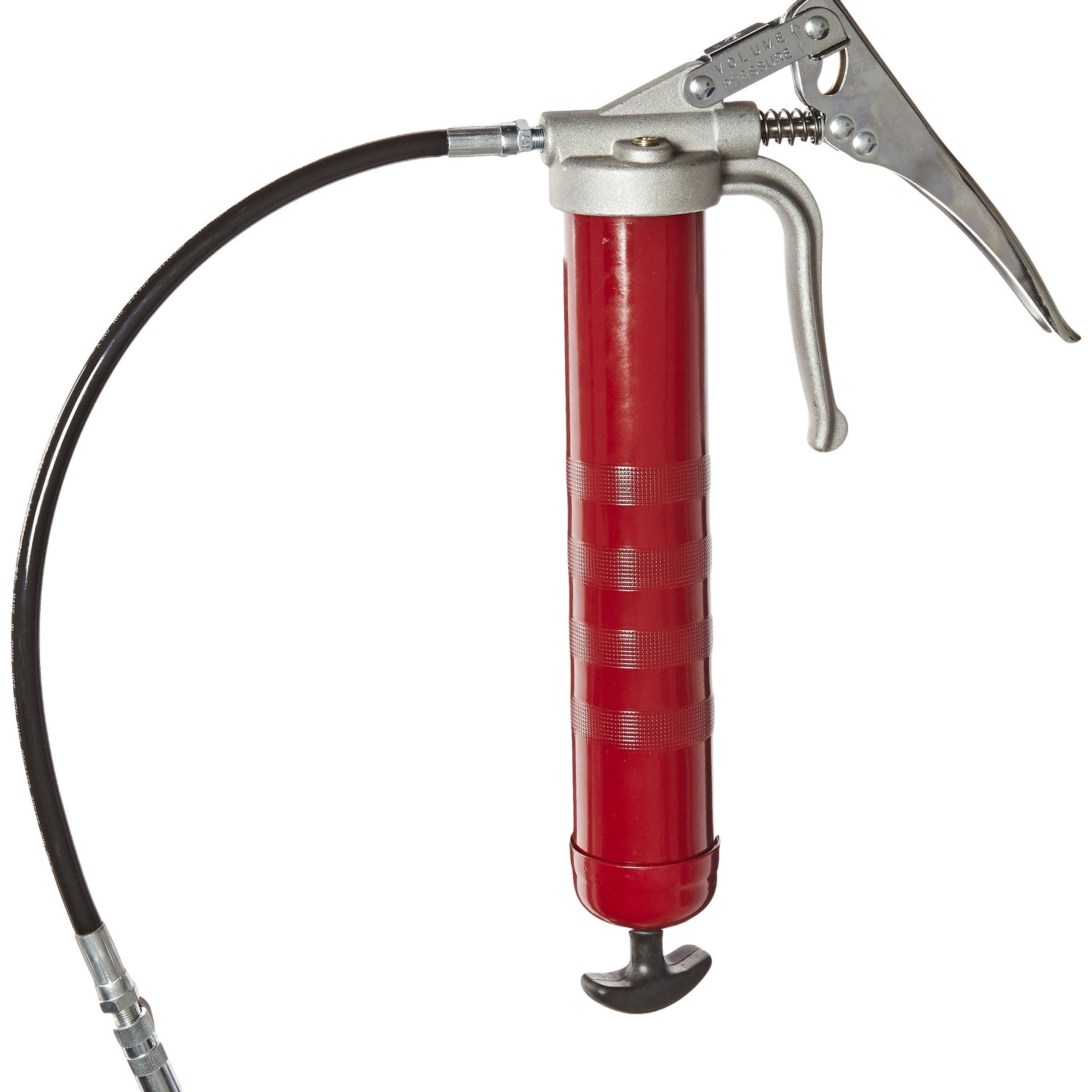 Details: This Alemite 555-E pistol grip grease gun, which comes with a flexible extension, has a cylinder capacity of 16 oz., and delivers lubricant at pressures up to 7,500 pounds per square inch (psi) at a rate of 1 oz. per 30 strokes in high-volume mode. A dual mode, pistol grip lever mechanism makes it possible to choose either high-volume output or high-pressure delivery. This grease gun loads grease either by bulk loading or inserting a grease cartridge. The follower has a heavy-duty spring to keep the grease gun primed, and a bleeder valve keeps the grease gun from building up excessive pressure in the cylinder. This grease gun injects grease into standard grease fittings and is suitable for applications such as lubricating motor vehicles, construction and industrial equipment, and aeronautics.