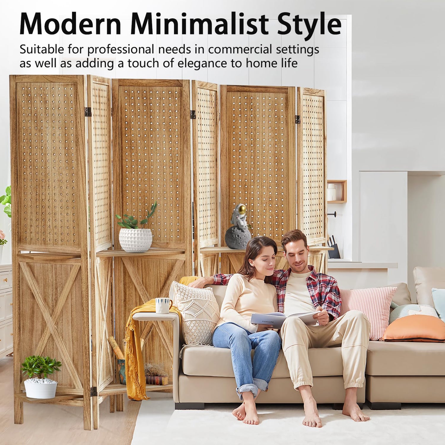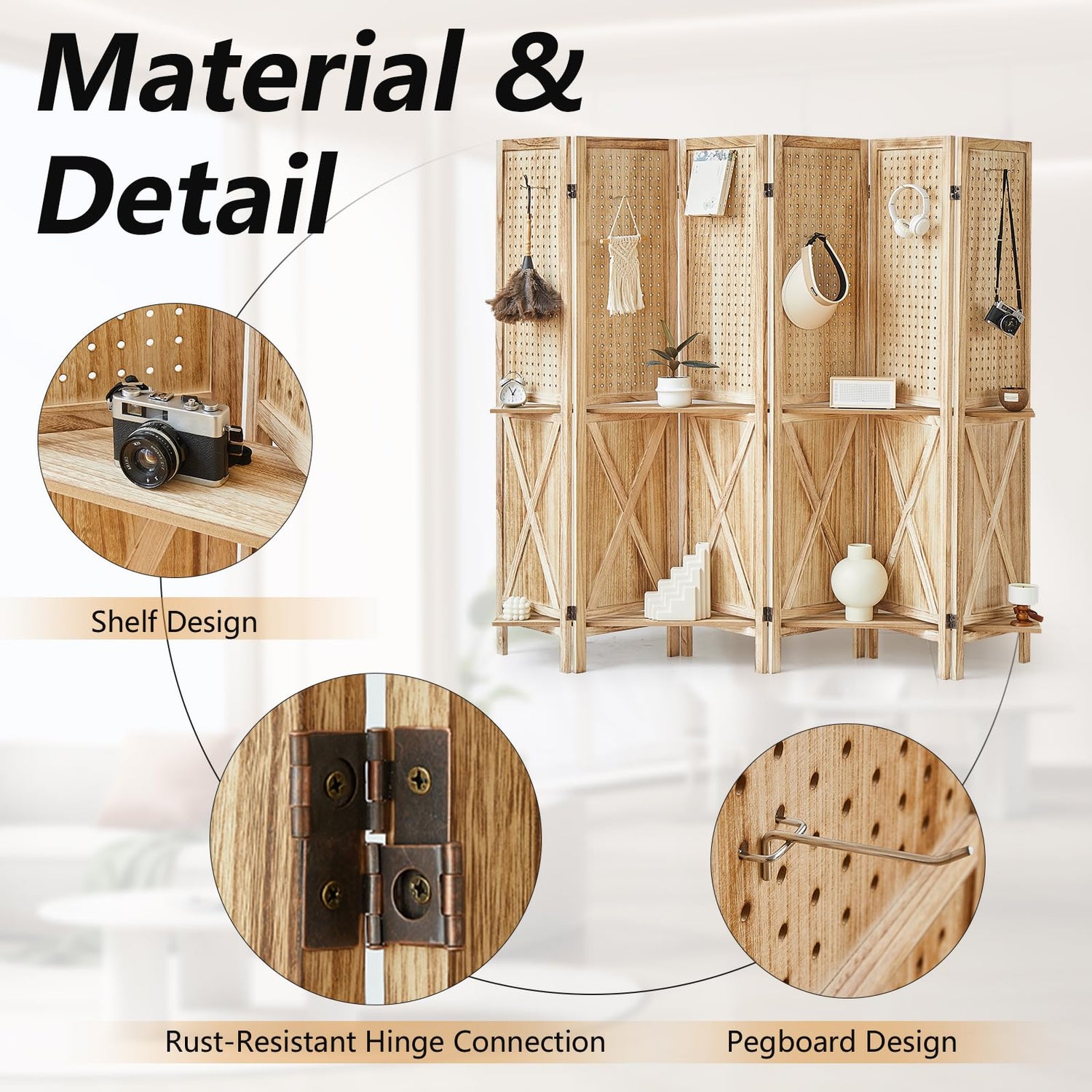Aletheiawu 6 Panel Room Divider with Shelves, Wooden Pegboard Room Dividers, 5.6Ft Room Partitions and Dividers, Room Divider Panel with 24 Hooks for Bedroom, Study, Shop, Natural Color