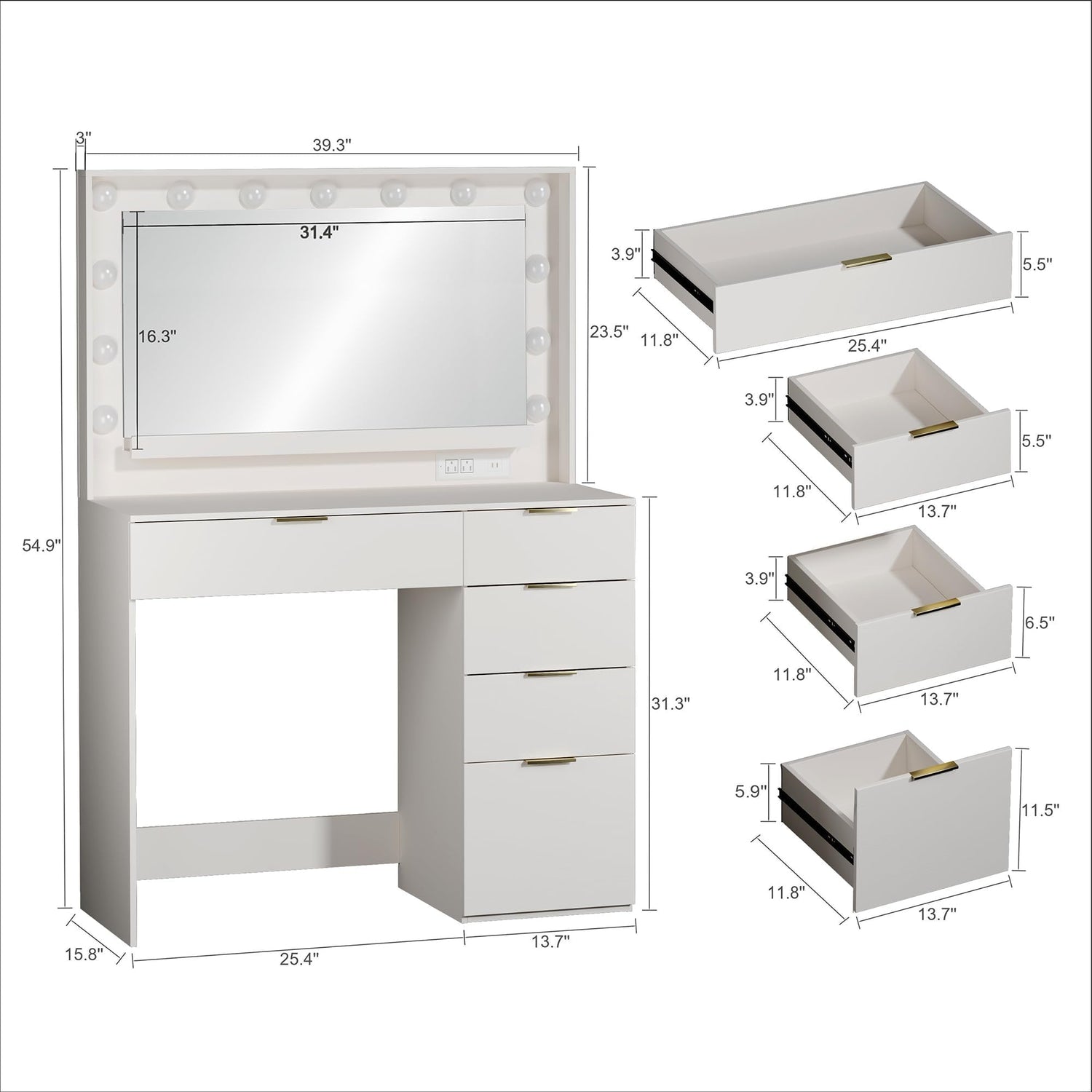 - Stylish and Functional Vanity Desk: The vanity desk is equipped with a charging station, including 2 USB ports and 2 standard sockets. The exquisite appearance of the white vanity, equipped with a dreamy large mirror, Hollywood bulbs and gold handles, is not only a vanity table, but also a decoration for your bedroom.