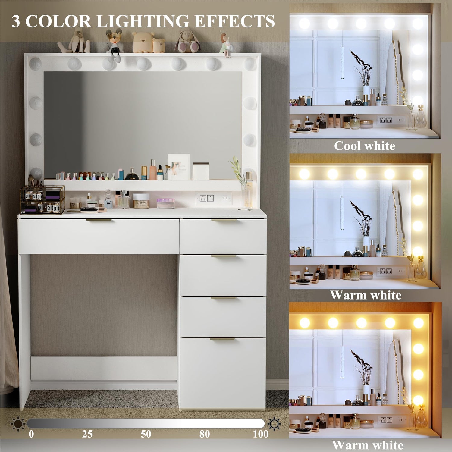 ALEXNUTRE Makeup Vanity Desk with Large Mirror and 13 LED Lights, Vanity Table with Power Outlet & 5 Drawers, 3 Lighting Color Adjustable, Vanity Desk for Bedroom and Dressing Room, White