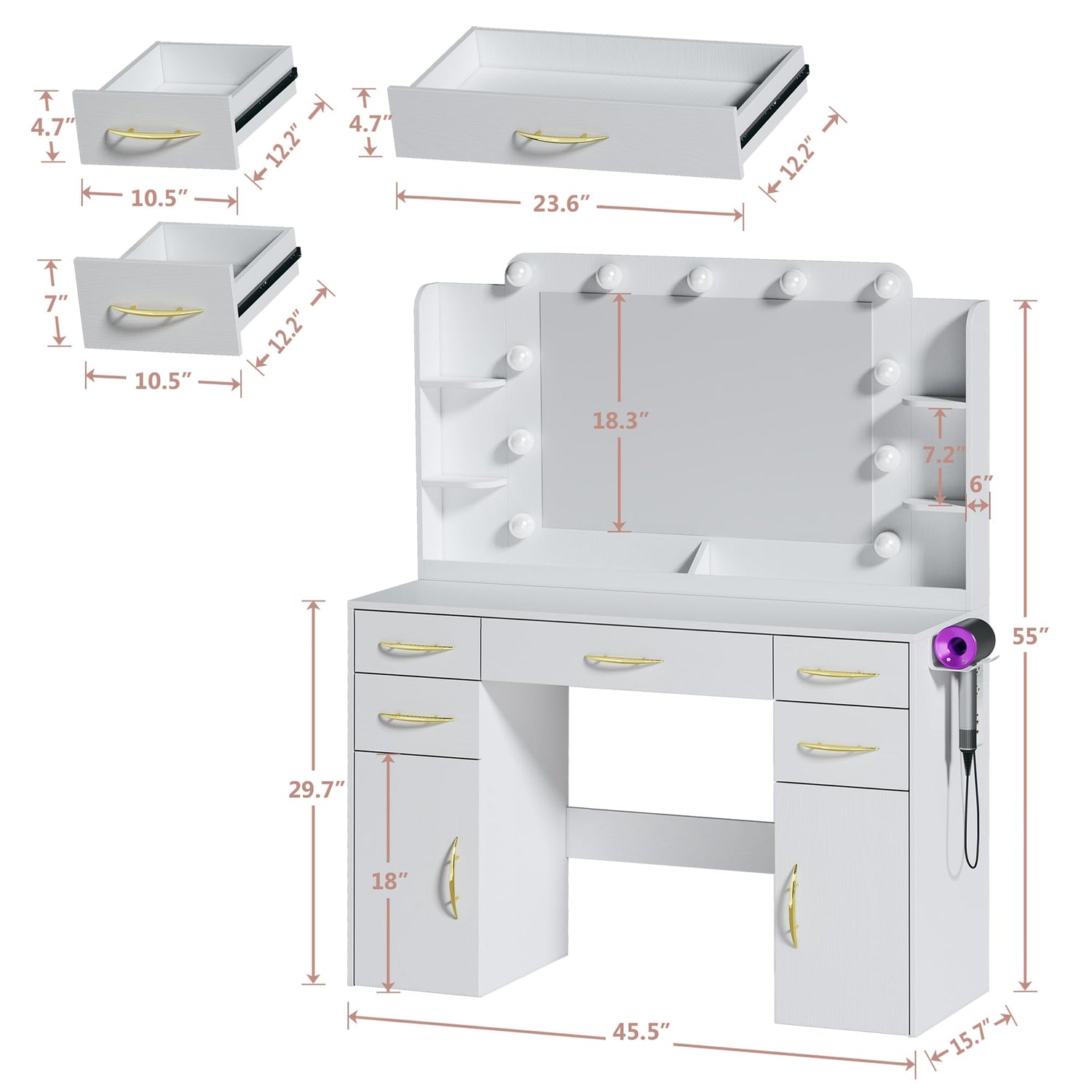 - 【Vanity with Ample Storage Space】Designed for maximum organization, the 45.5" vanity desk includes 1 large drawer, 4 medium drawers, 2 large cabinets, 2 side storage shelves, and 2 makeup tray. The vanity desk with drawers features quiet slides for easy operation, and the hairdryer rack adds extra convenience.