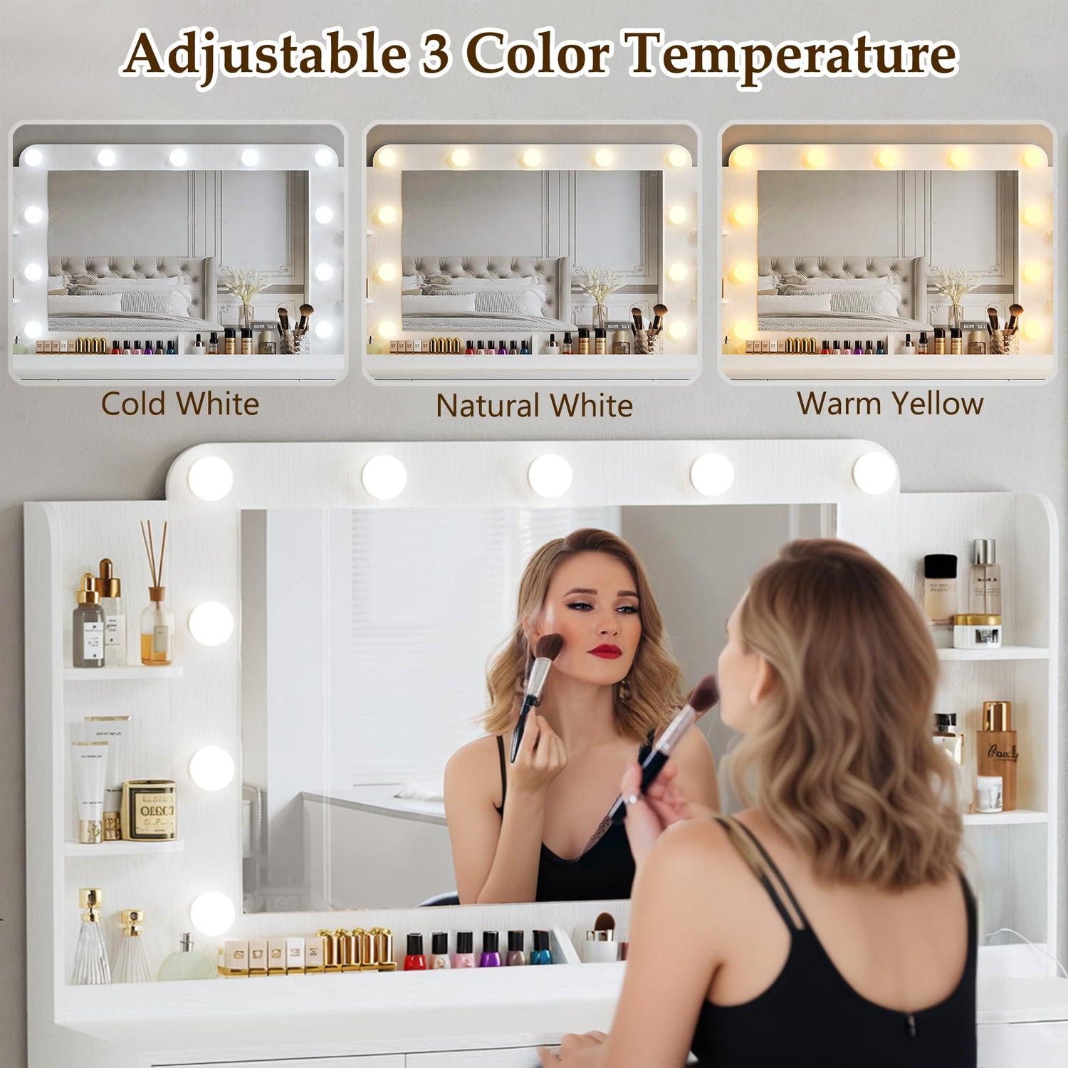 - 【Vanity with Lights in 3 Lighting Modes】Vanity desk comes equipped with 11 Hollywood-style lights that offer 3 distinct color modes: natural, warm, and cool. Adjust the lighting to create the perfect ambiance for your beauty routine. The large mirror provides a comprehensive view, ensuring flawless makeup application every time.