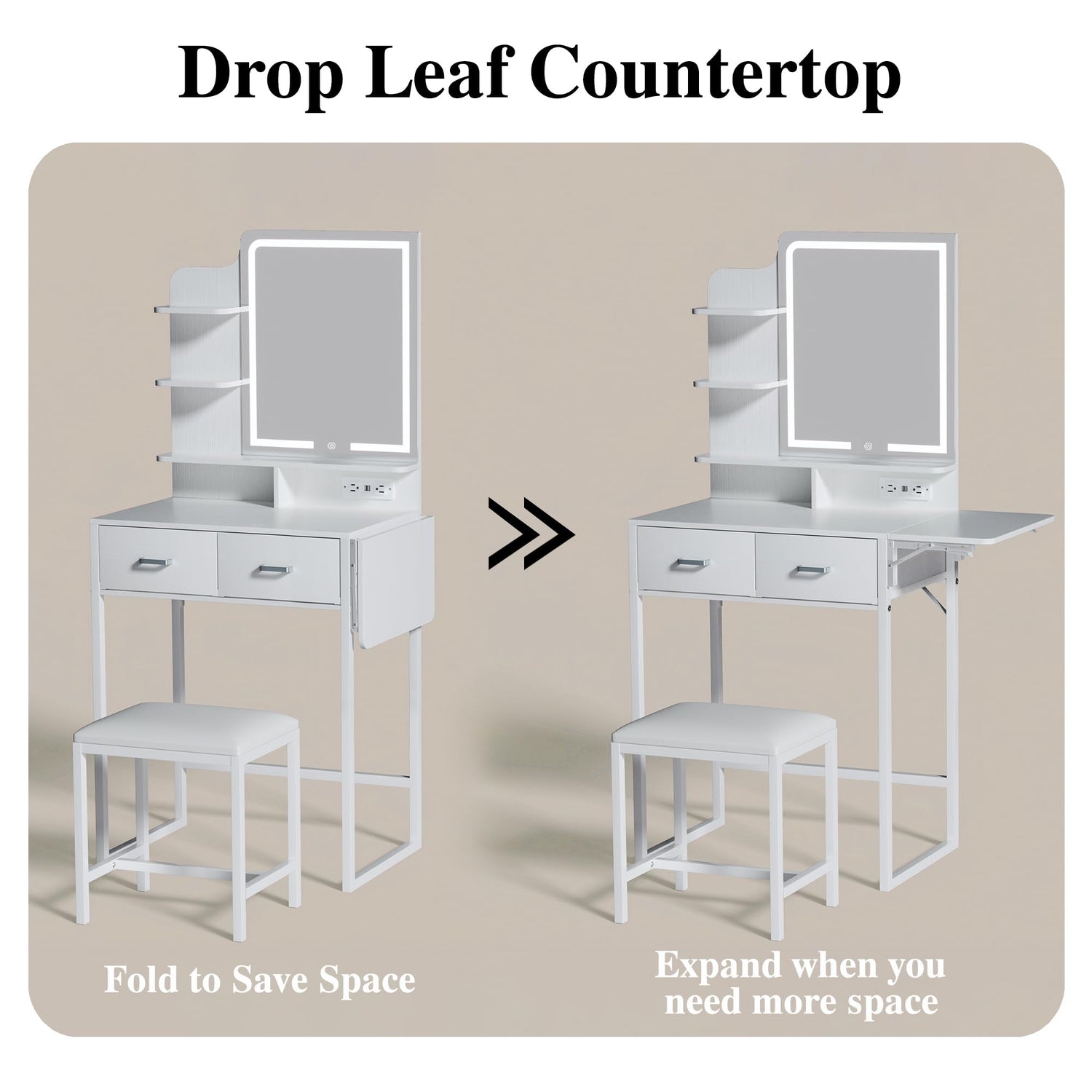 - Extra Space: In addition to storage drawers and shelves, our vanity desk with mirror and lights features a foldable side panel that can be installed on the left or right side of the vanity according to your needs. Even if it's a small vanity desk, it still provides plenty of space for you to do your makeup.