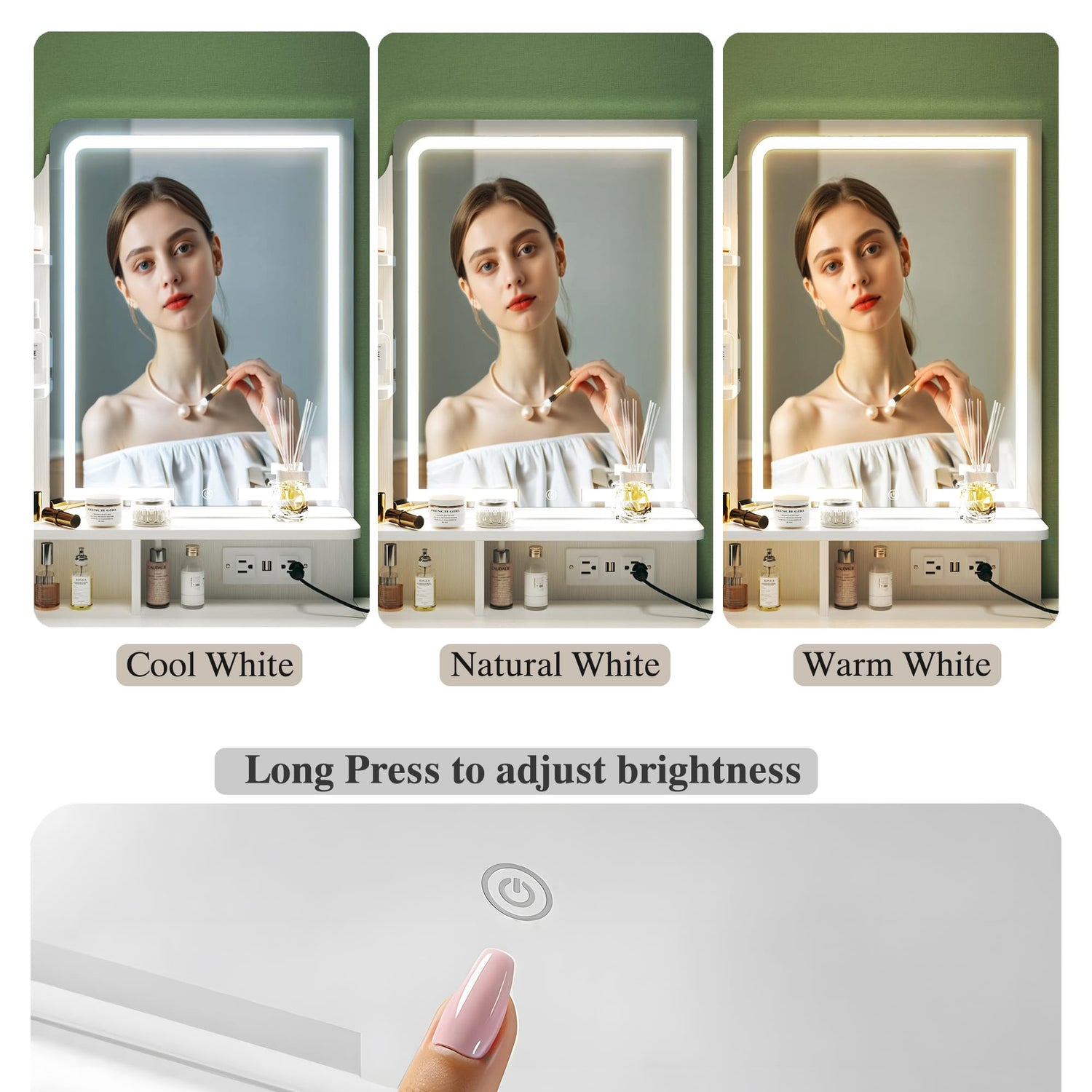 - Makeup Vanity Desk with Lights: Our makeup vanity desk comes with LED lighted mirror featuring 3 modes (warm, natural, and cool). You can adjust the brightness for different environments and makeup needs by long-pressing the screen.