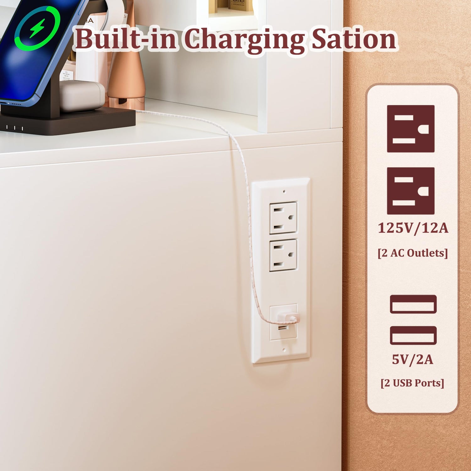 - Multifunctional Vanity Desk: The vanity desk with mirror and lights with lights features a power outlet with 2 AC outlets, 2 USB ports, and a Type-C port. The exquisite appearance of the white vanity, equipped with a dreamy large mirror, Hollywood bulbs and gold handles, decoration for your bedroom.