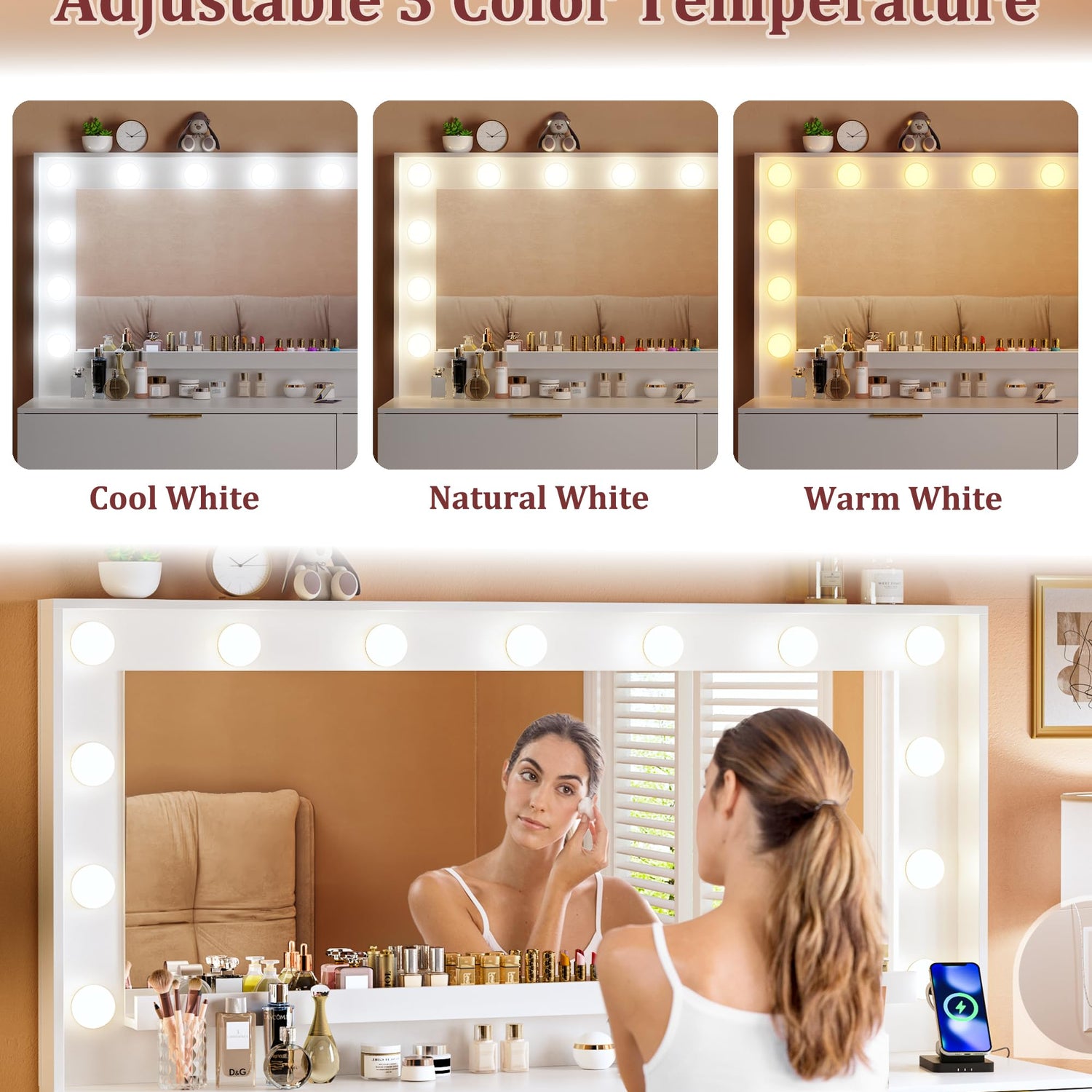 - Vanity with Large Mirror: Vanity desk with mirror and lights customize with 3 color modes of cool white, warm white and warm yellow, Simulates a wide range of lighting conditions to ensure makeup looks its best in any environment