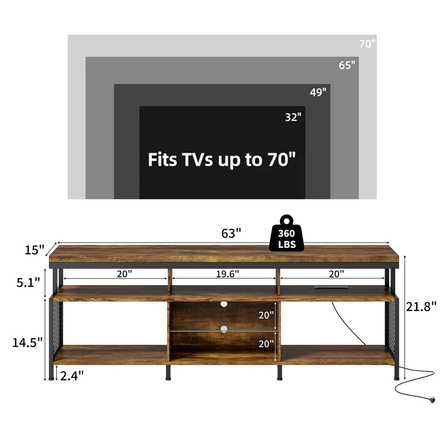 Details: Algglobuy TV stand for 65 75 inch TV with LED lights. Our TV stand for bedroom features a particleboard top, tempered glass shelf, and a three-tier open metal frame, ensuring long-lasting stability and reliability. The TV console table top supports up to 360 lbs, offering strong and secure support for your entertainment center. Industrial TV console table for living room, bedroom. (63.0"L x 15.0"D x 21.8"H)