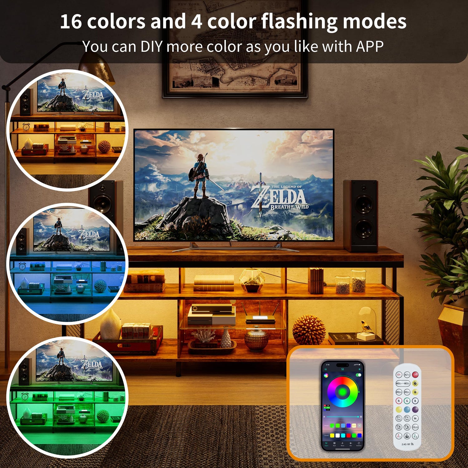- Versatility: Our entertainment center comes equipped with a built-in charging station (2AC & 2USB) and LED lights that support 16 colors and 4 flashing modes. More than just a spot for your TV, it’s a multifunctional storage solution designed to meet all your entertainment needs. Perfect for any space whether it's your bedroom, living room, or office