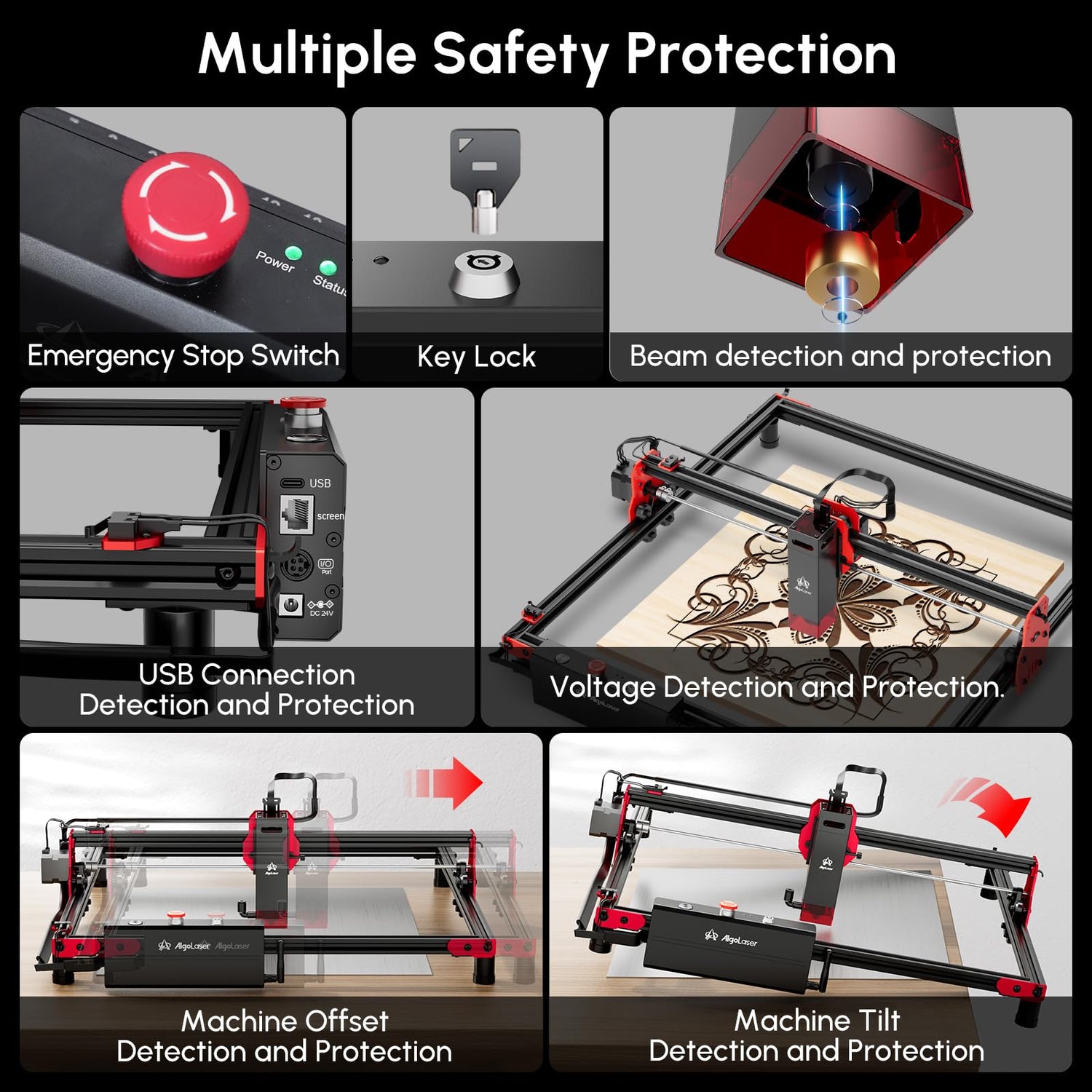 - 【Multiple Safety Protection】: Machine Offset Detection and Protection. Machine Tilt Detection and Protection.USB Connection Detection and Protection.Beam detection and protection. Voltage Detection and Protection. Emergency Stop Switch. Key Lock, the Secure Key Lock Prevents Unauthorized Access.