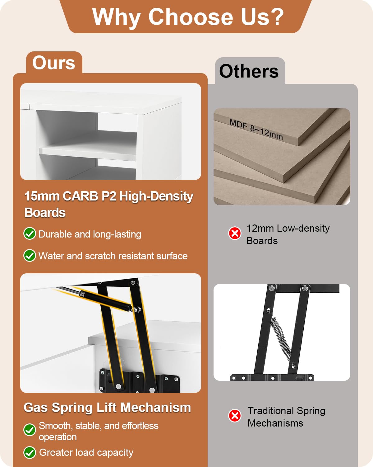 • Quality Materials: This white lift top coffee table is crafted from 15mm CARB P2 engineered wood and solid wood legs, ensuring structural stability and durability. The water-resistant and scratch-resistant surface offers extended longevity