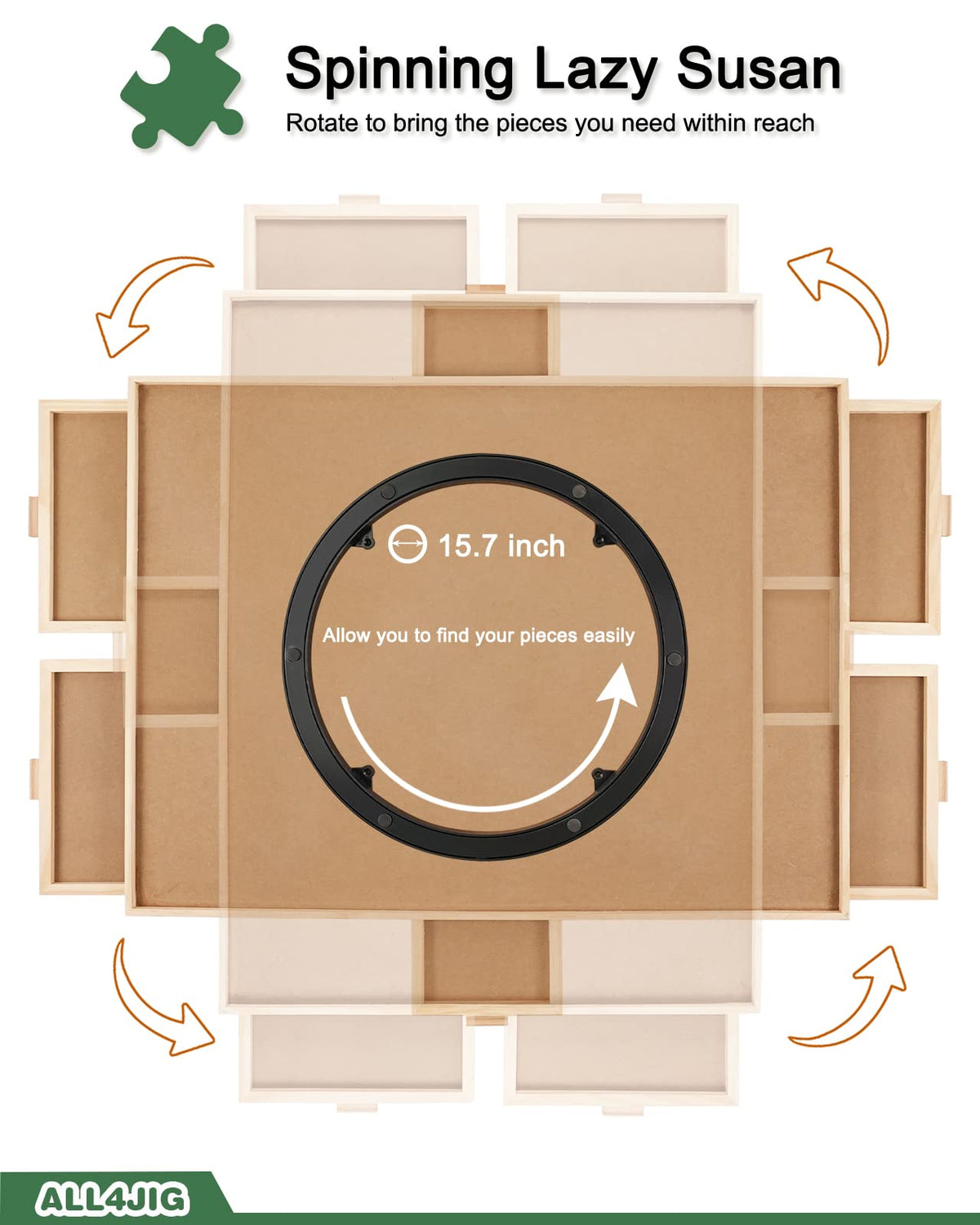 - 【Spinning LAZY SUSAN Design】An enjoyable and efficient way to assemble your jigsaw puzzles with our spinning puzzle table. Finding your pieces with ease,reaching to any section you need, Lazy Susan under create a wonderful swivel system for 360°smooth and steady rotation, triple funny puzzling interaction and strategic stimulation.