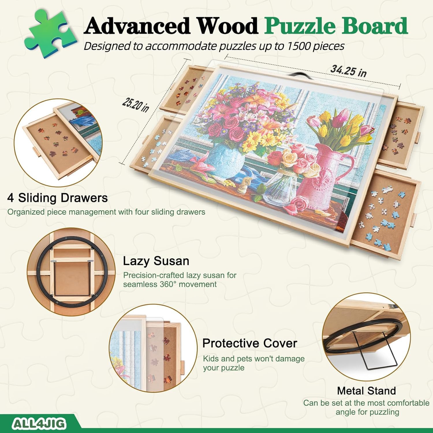 ALL4JIG 2-in-1 Tilting & Rotating Puzzle Board for 1500 Pieces, 34.2" x 25.2"Adjustable Angle Puzzle Board with 4 Drawers & Clear Protective Cover, Birthday Gift for mom