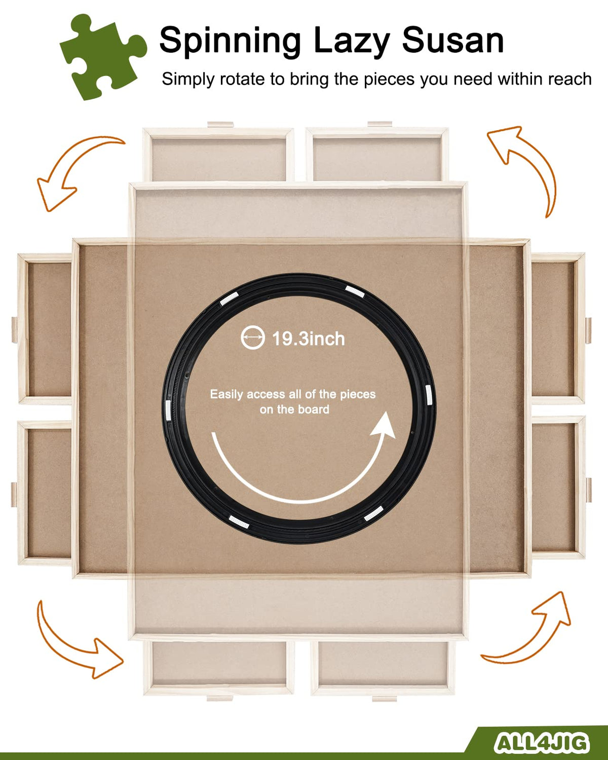 - 【Spinning LAZY SUSAN Design】An enjoyable and efficient way to assemble your jigsaw puzzles with our spinning puzzle table. Finding your pieces with ease,reaching to any section you need, Lazy Susan under create a wonderful swivel system for 360°smooth and steady rotation, triple funny puzzling interaction and strategic stimulation.