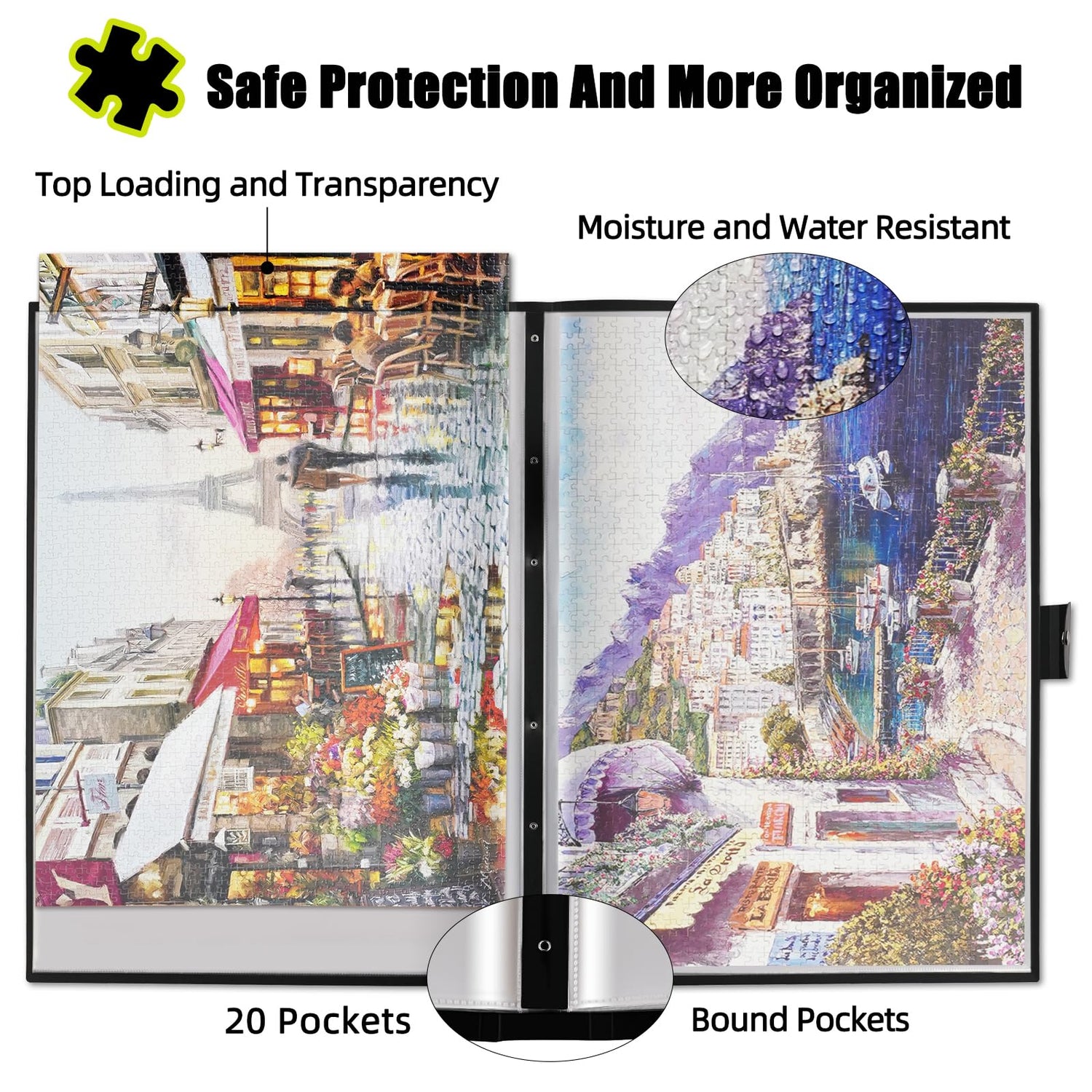 - Maximized Puzzle Storage: Elevate your collection with our premium puzzle storage folder. It features 20 crystal-clear, high-definition pockets, each tailor-made to preserve puzzles ranging from 500 to 1000 pieces, accommodating sizes up to 27 by 20 inches. This expansive puzzle case transcends simple storage, providing a haven for puzzle frames of 1000 pieces and smaller sets. Our folder reclaims your space, offering an orderly appealing way to organize your extensive puzzle collection.