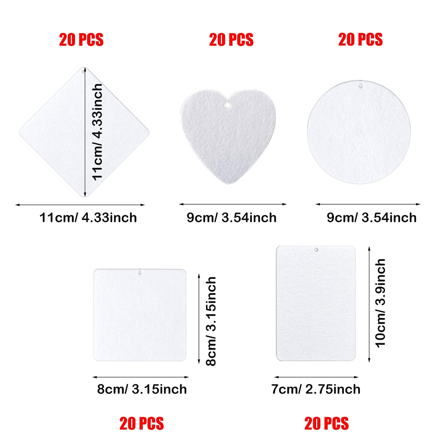 - Rich air freshener blank kits: includes 100 x air freshener blank with elastic rope (20 x rectangle, 20 x square, 20 x round, 20 x heart-shaped, 20 x diamond), 20 x wave bead chain, 10 x keychain, 10 x key hanging buckle, 20 x tassel.