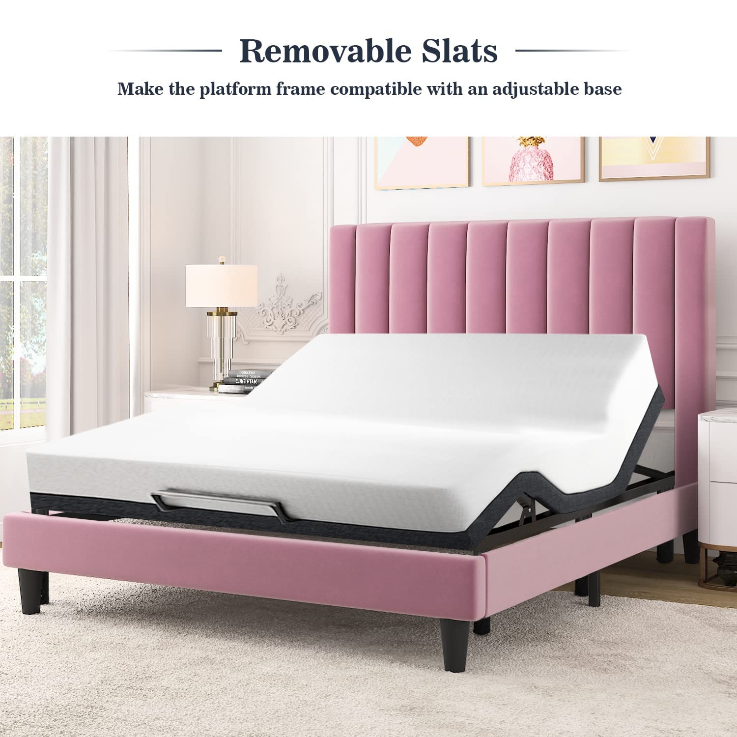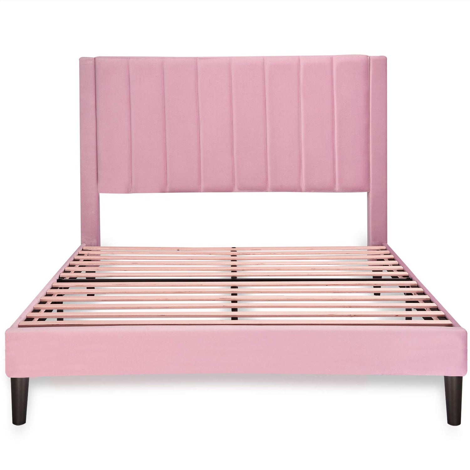 Allewie Full Platform Bed Frame/Velvet Upholstered Bed Frame with Vertical Channel Tufted Headboard/Strong Wooden Slats/Mattress Foundation/Box Spring Optional/Easy Assembly/Pink