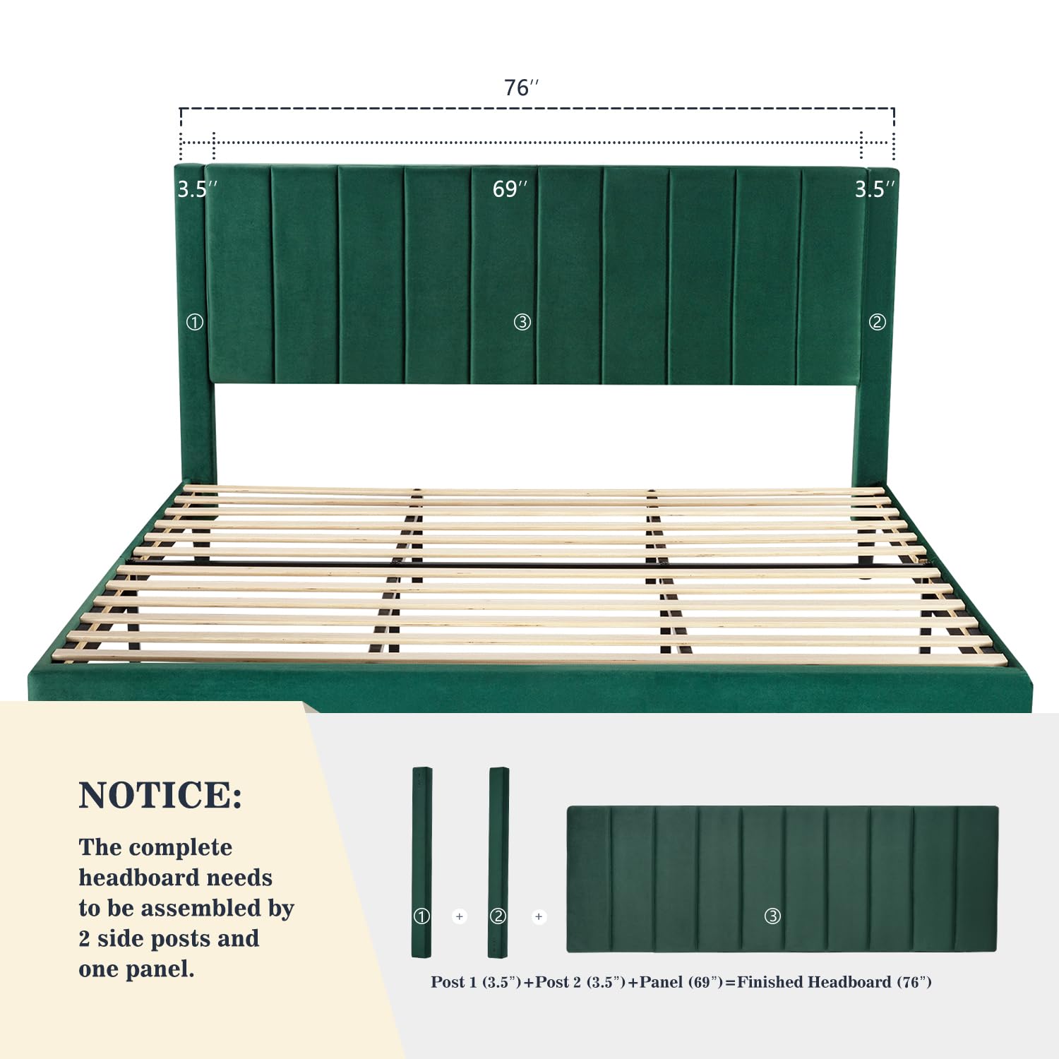 Allewie King Platform Bed Frame/Velvet Upholstered Bed Frame with Vertical Channel Tufted Headboard/Strong Wooden Slats/Mattress Foundation/Box Spring Optional/Easy Assembly/Green