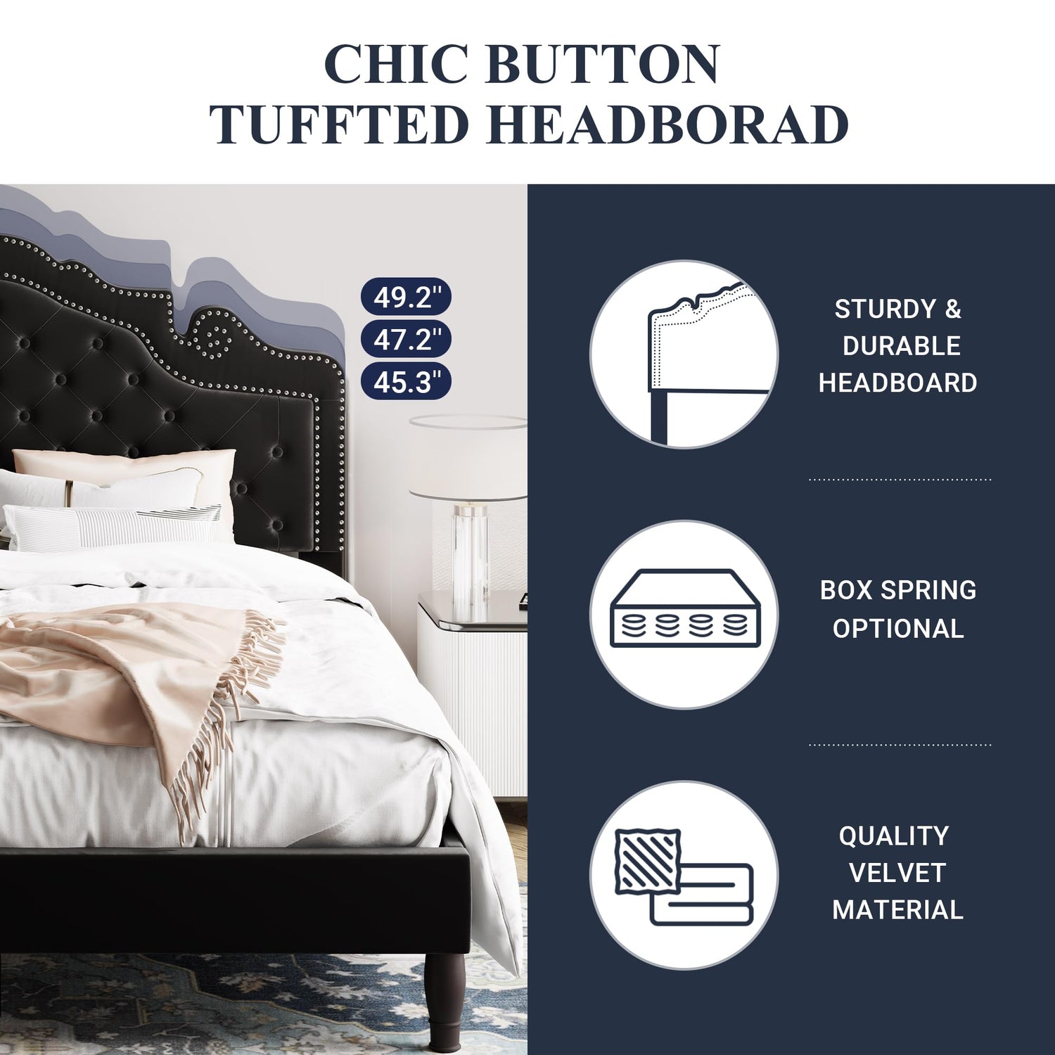 Allewie King Size Platform Bed Frame with Adjustable Velvet Tiara Headboard, Upholstered Diamond Button Tufted, Wood Slats Support, No Box Spring Needed, Mattress Foundation, Easy Assembly, Black