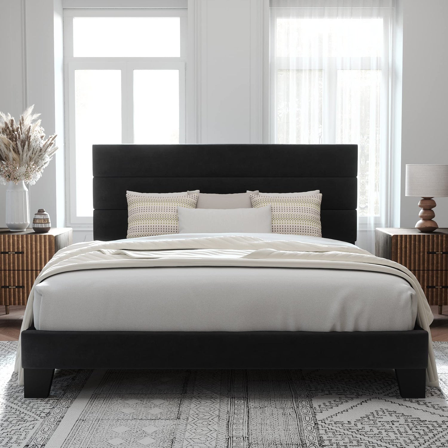 Allewie King Size Platform Bed Frame with Velvet Upholstered Headboard and Wooden Slats Support, Fully Upholstered Mattress Foundation/No Box Spring Needed/Easy Assembly, Black