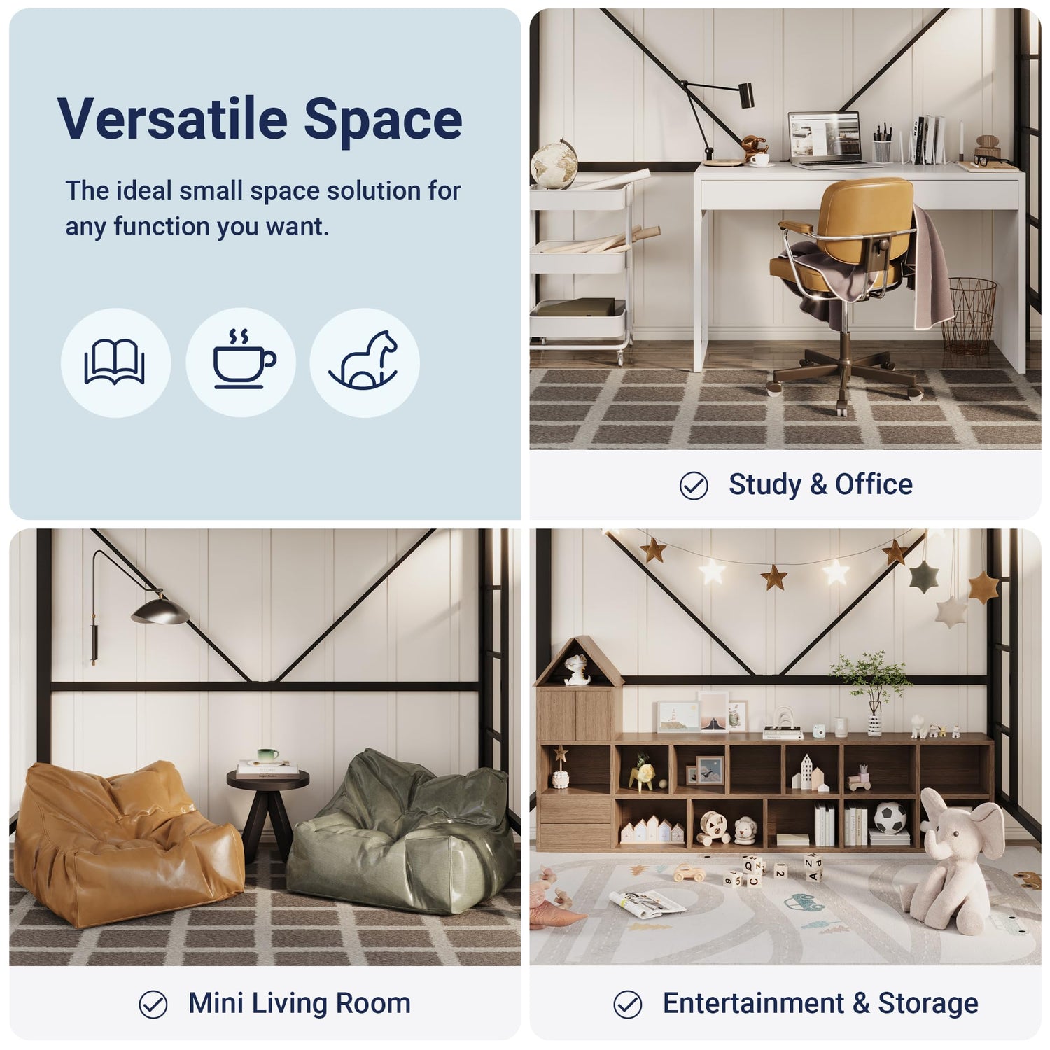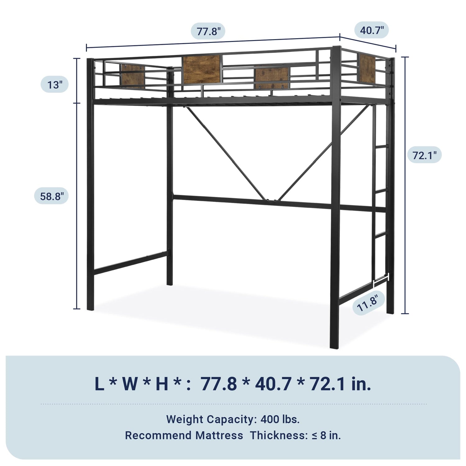 Crafted with a robust square frame structure, this bed frame offers exceptional stability with a remarkable maximum bearing capacity of up to 400 lbs. This ensures that you can enjoy a restful night’s sleep knowing that your loft bed can support you securely.
