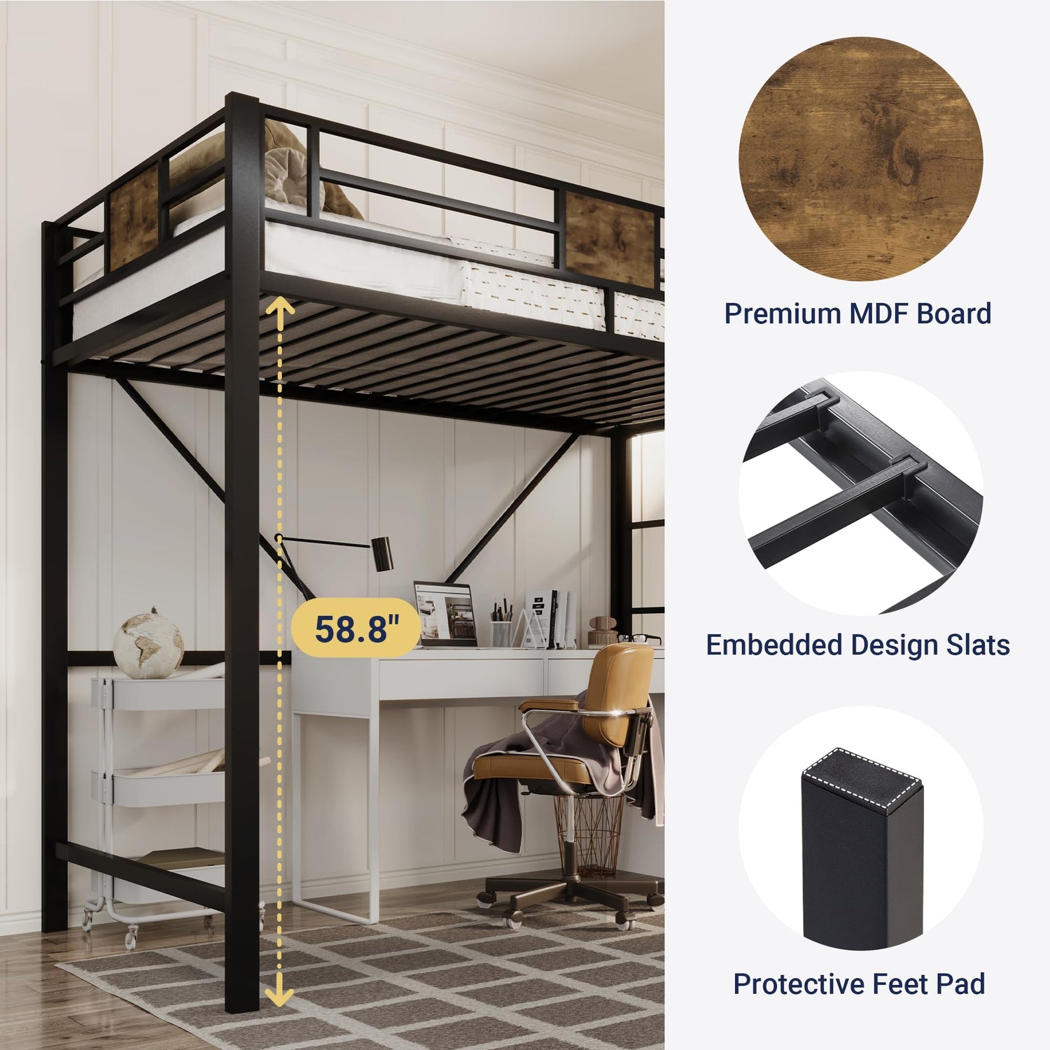 One of the standout features of this loft bed is its space-saving design. With an impressive 58.8 inches of clearance underneath, you have plenty of room to utilise for additional furniture, storage, or even a TV station. This versatility makes it a fantastic option for small living spaces where every inch counts.