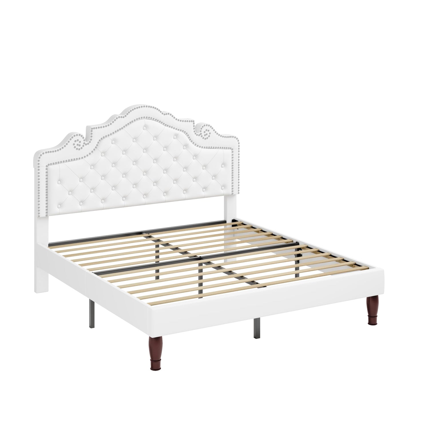 Allewie Queen Bed Frame with Adjustable Velvet Tiara Headboard, Upholstered Diamond Button Tufted Platform Bed, Wood Slats Support, No Box Spring Needed, Mattress Foundation, Easy Assembly, White