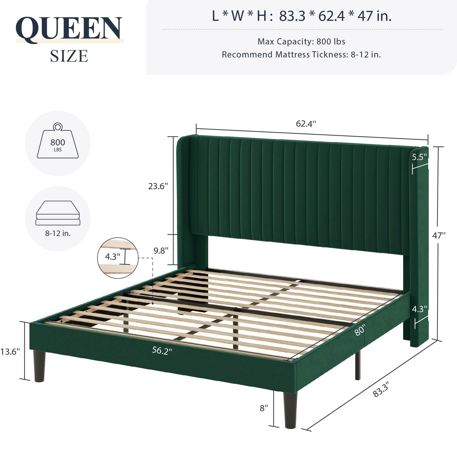 Allewie Queen Size Bed Frame/Velvet Upholstered Platform Bed/Vertical Channel Tufted Wingback Headboard/Strong Wooden Slats/No Box Spring Needed/Easy Assembly/Green