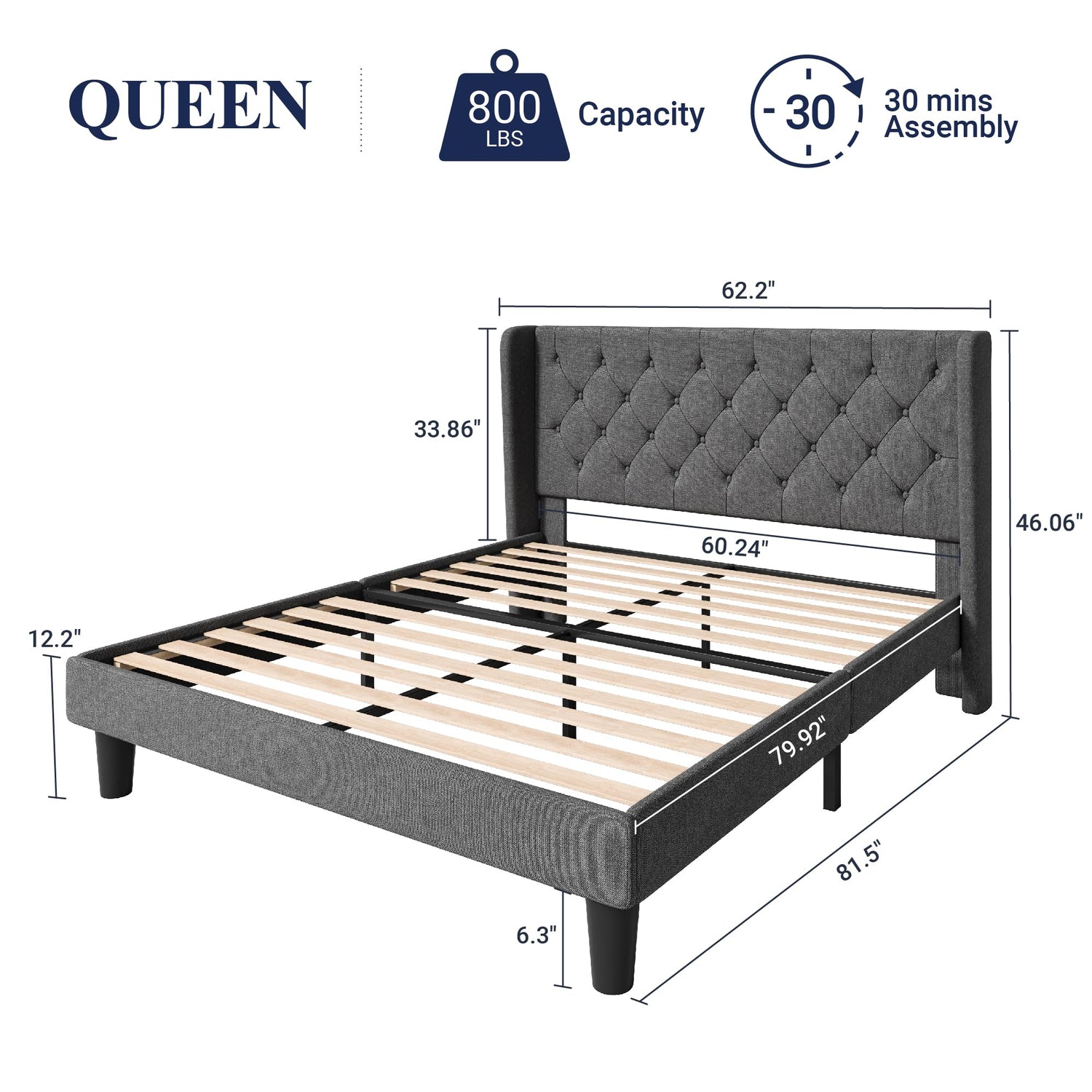 - MODERN UPHOLSTERED PLATFORM BED: Exquisite button tufted headboard with wingback design can match a variety of bedroom styles perfectly. The fabric material has strong breathability and brings you a skin-friendly touch