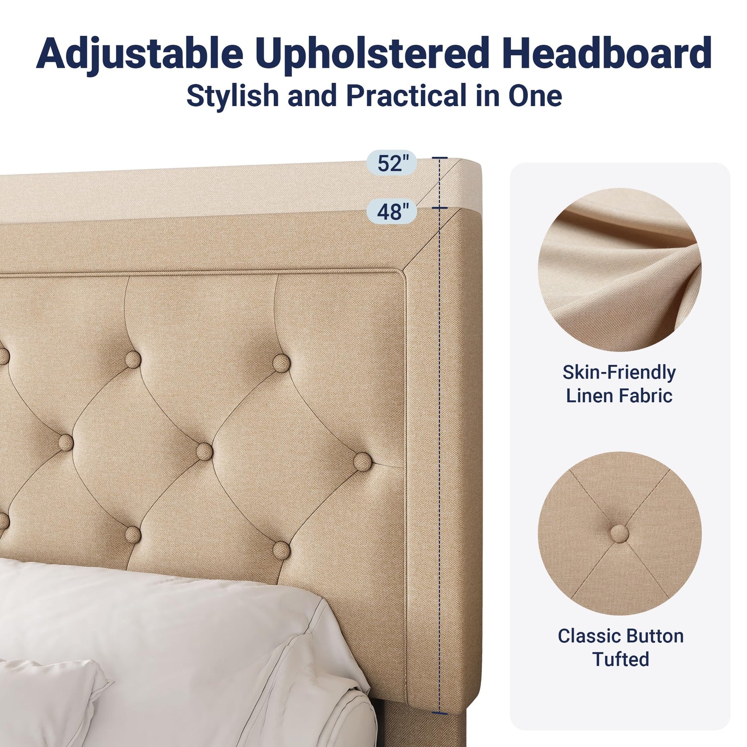 - Stylish and Comfortable: With Upholstered linen and tufted button headboard, this classic silhouette bed frame can match a variety of bedroom styles perfectly. Thick and dense foam padding gives you comfortable touch.