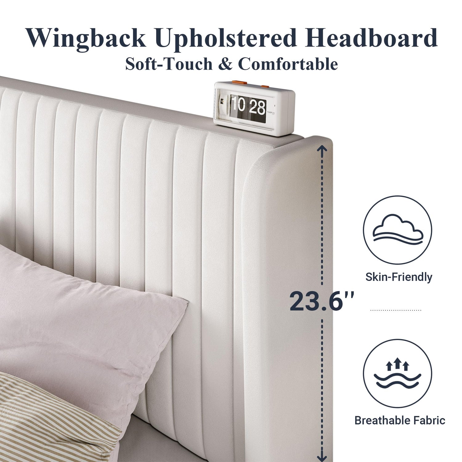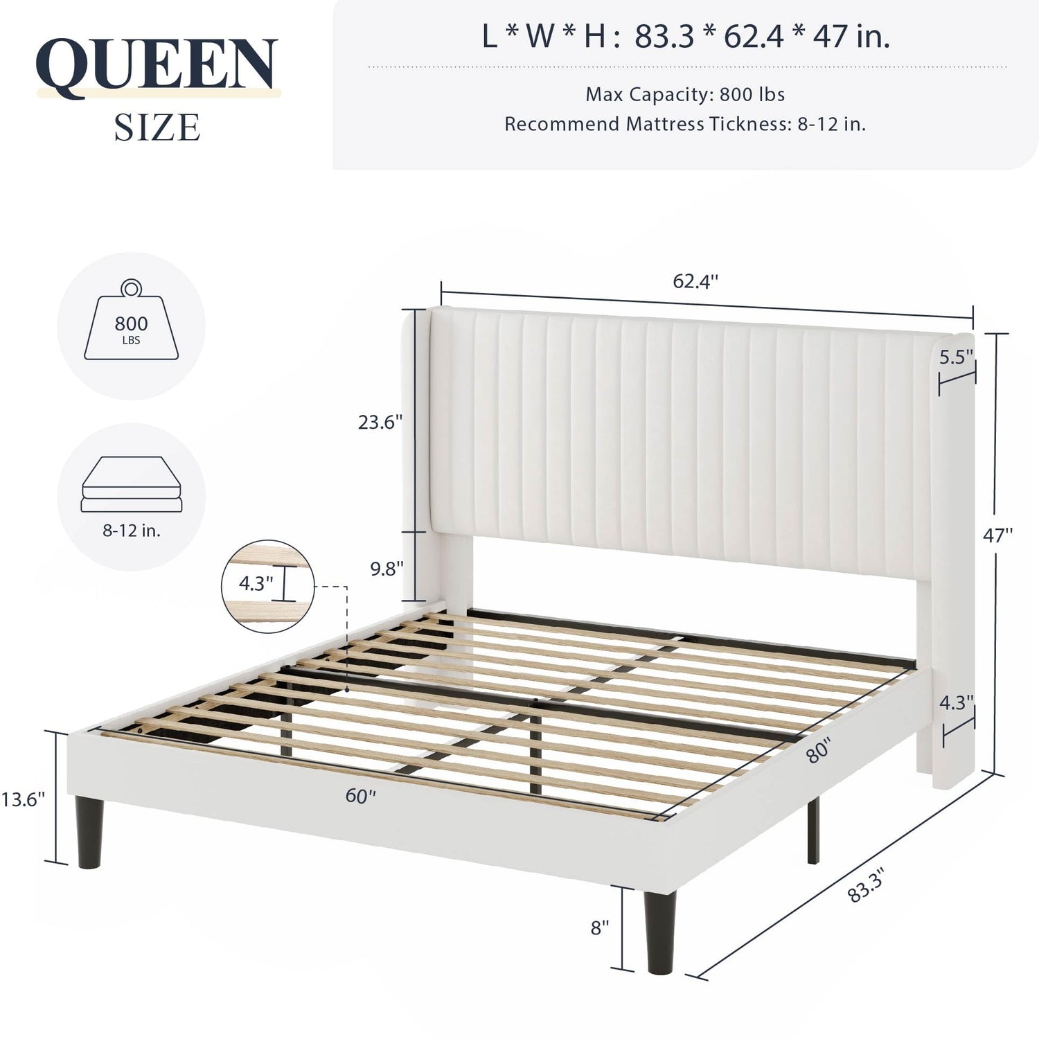 Allewie Queen Size Velvet Bed Frame/Vertical Channel Tufted Wingback Headboard/Upholstered Platform Bed/Strong Wooden Slats/No Box Spring Needed/Easy Assembly/White