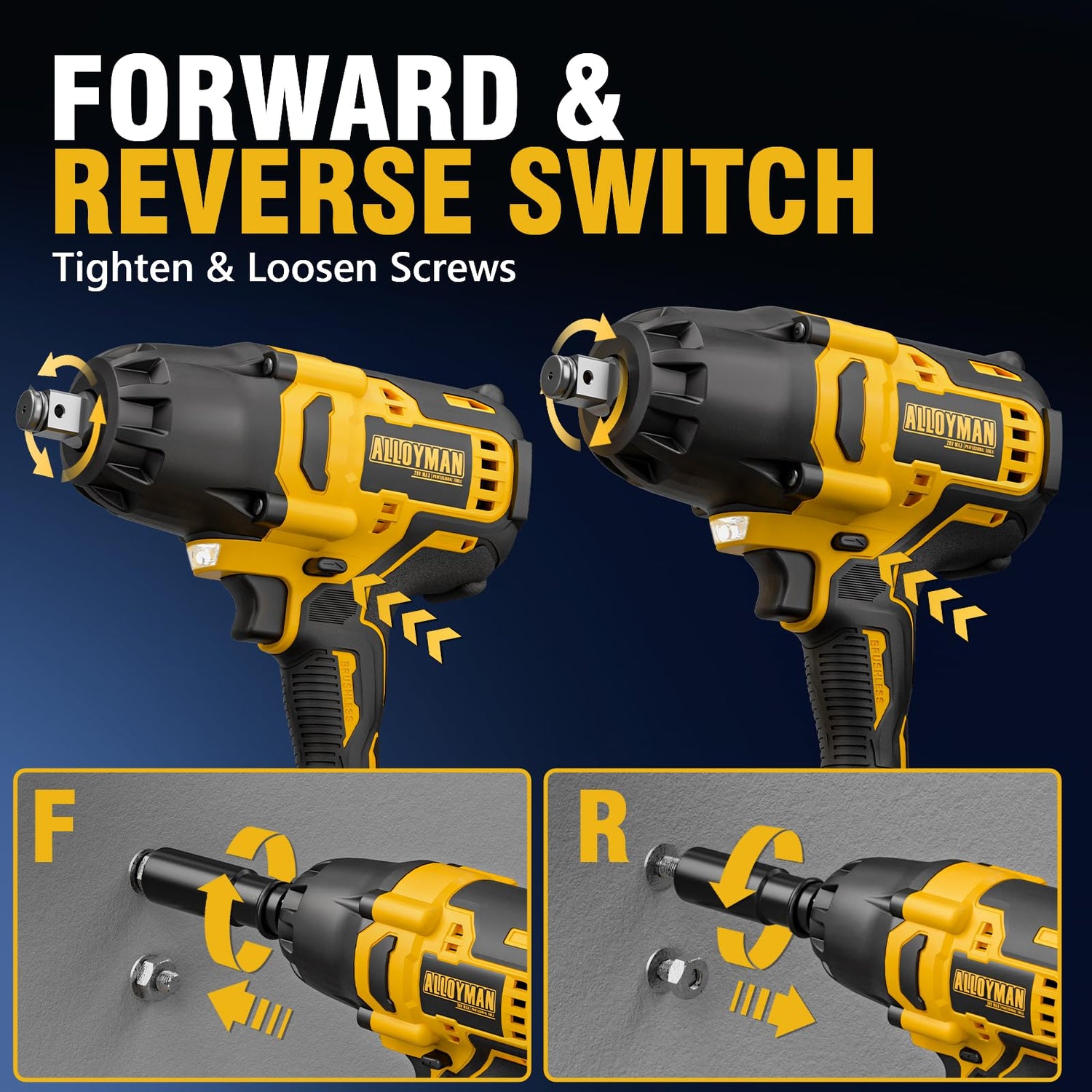 Alloyman 1/2 inch Impact Wrench Cordless, Max Torque 555 Ft-lbs Battery Impact Wrench 20V Brushless Motor 2000 RPM, with 6 Sockets, 3 Extension Bars, 4.0 AH Li-ion Battery and 1 Hour Fast Charge