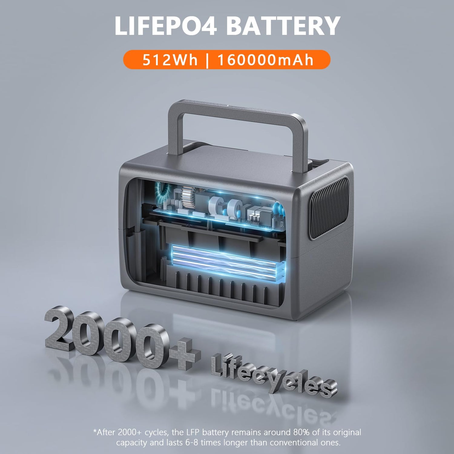 ALLWEI Portable Power Station 500W, 512Wh LiFePO4 Battery, UPS Function, 2.5Hrs Fast Charge, 3 AC Outlets(Surge 1000W), Solar Generator for Outdoor Camping RV CPAP Home Emergency