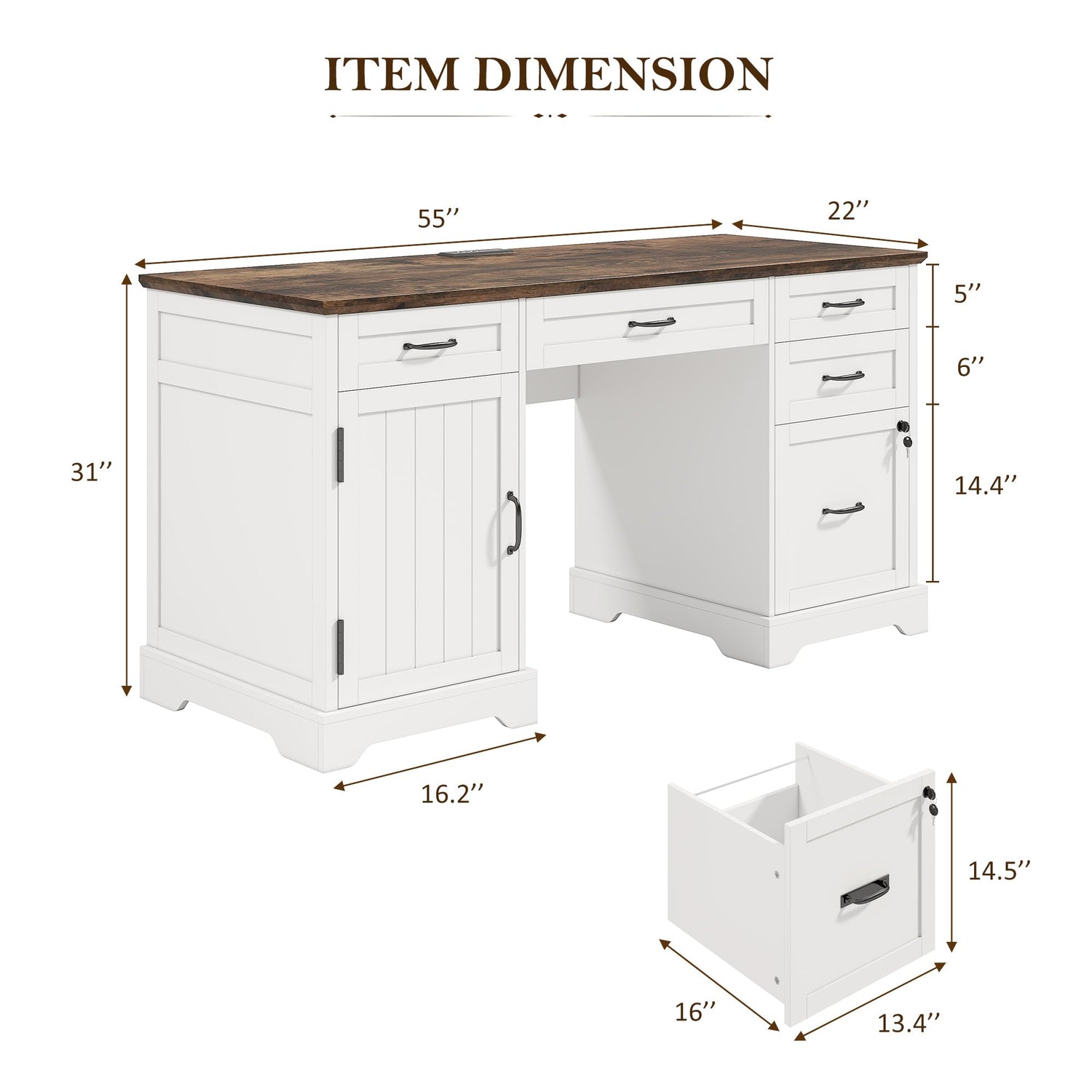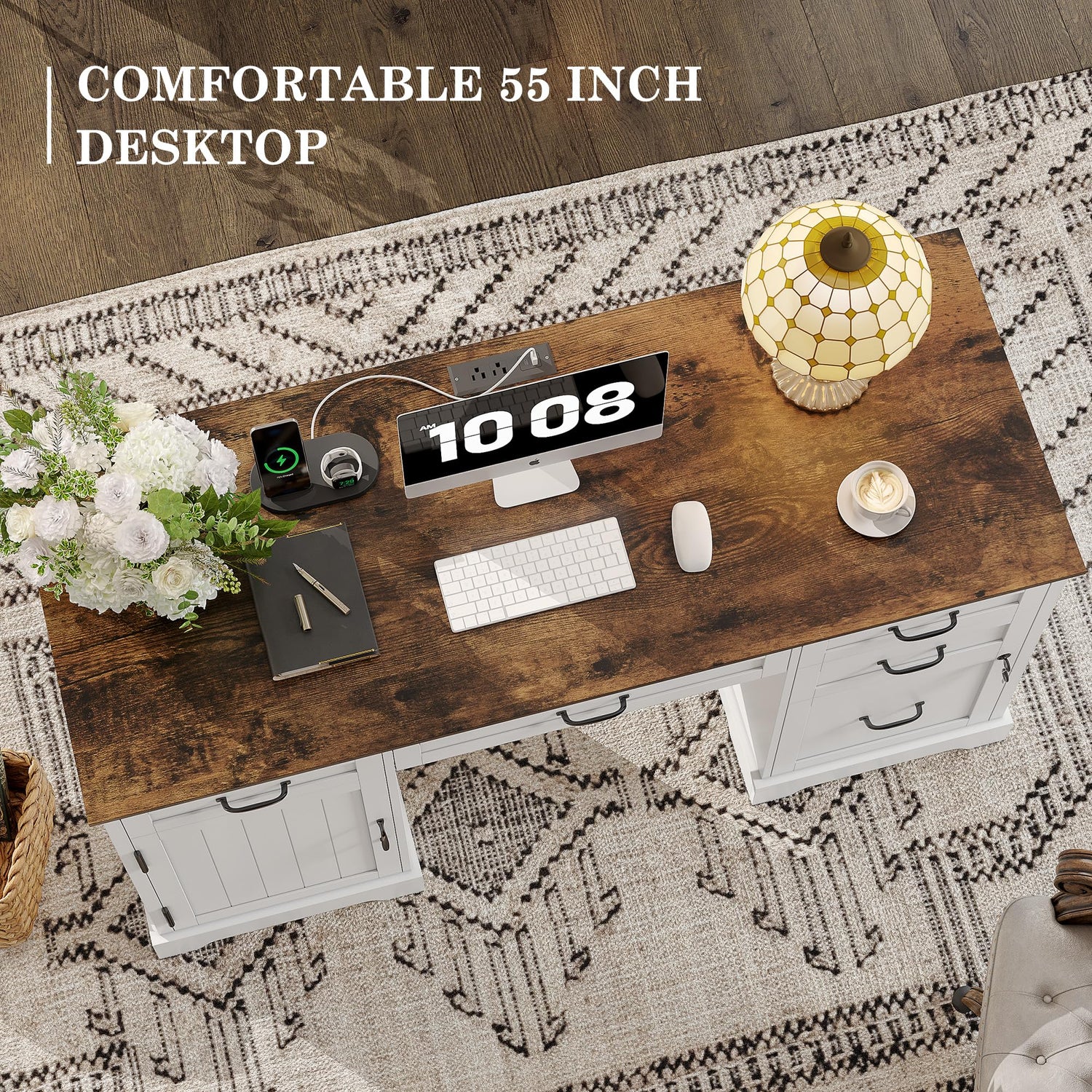 Alohappy 55'' Farmhouse Executive Desk, Home Office Desk with Drawers, Wood Computert Desk with File Cabinet and Power Outlets, White