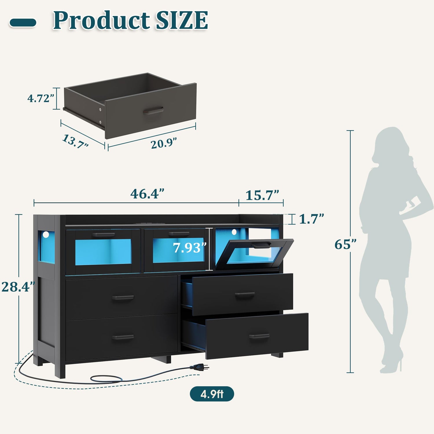 - 7 Drawers Dresser Storage Cabinet: This chest of drawers for bedroom has 4 large drawers, 3 transparent LED visual drawers on the top and equipped with flap doors, suitable for sorting and organizing your clothes, blankets, scarves, socks, etc. The large desktop is perfect for placing table lamps, alarm clocks, books and other daily necessities. This black dresser for bedroom provides ample storage space for your bedroom, hallway or nursery.